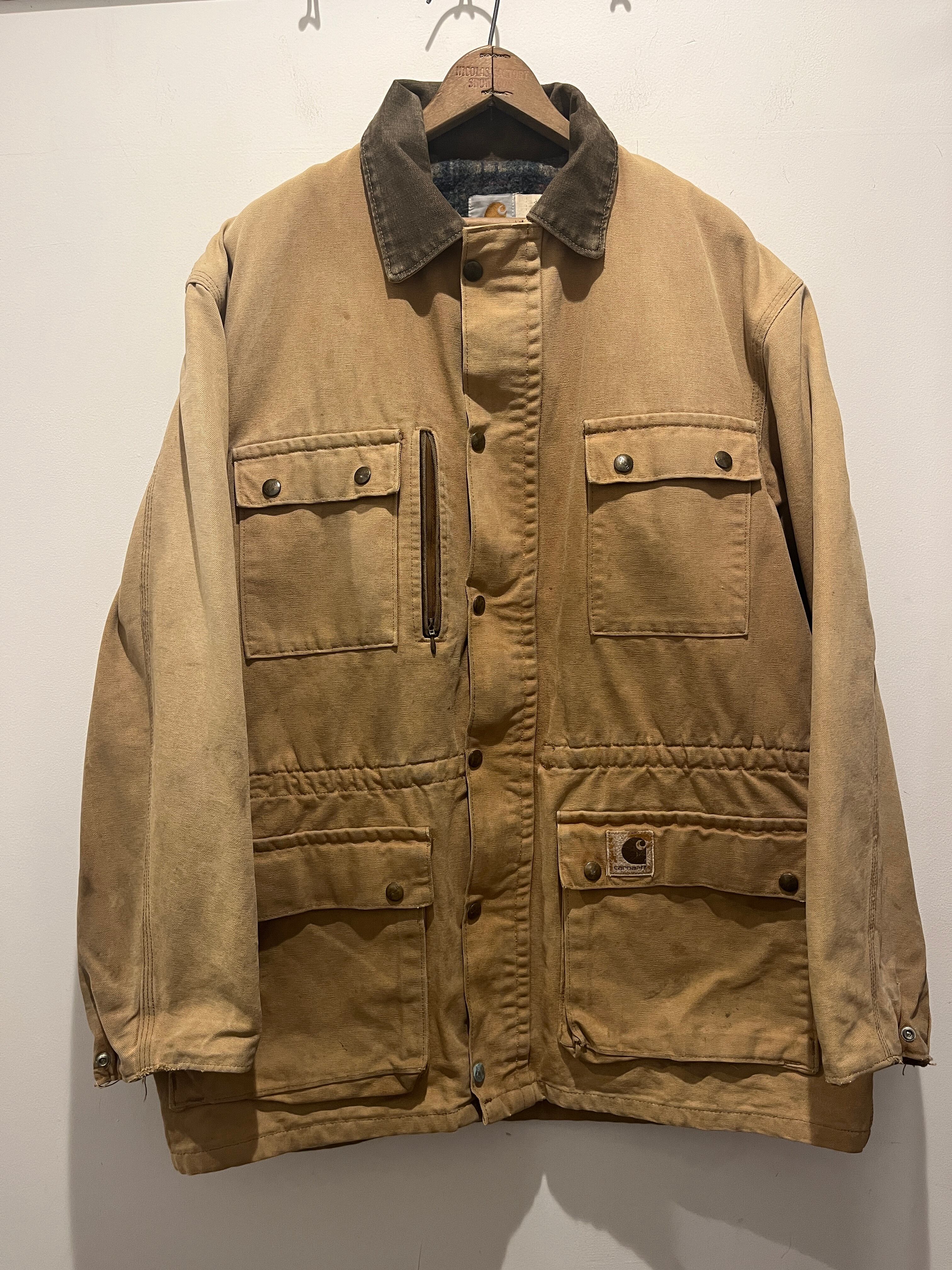 90年代アメリカ製カーハートのダックジャケットです。モデル名は不明ですが1995年5月製のカバーオールの様なジャケットとなります。襟の切り返しがコーデュロイ素材では無くブラウンダックになっていたりフラップ付きのポケットや縦ジップのスラッシュポケットもあったりとナイスなディテールです。裏地も半分ブランケットで袖内側はキルティング仕様と着用しやすいのもポイントですね。リアルなアメリカワーク着で雰囲気も良くMサイズ表記ですが大きめな作りとオススメな1着です。