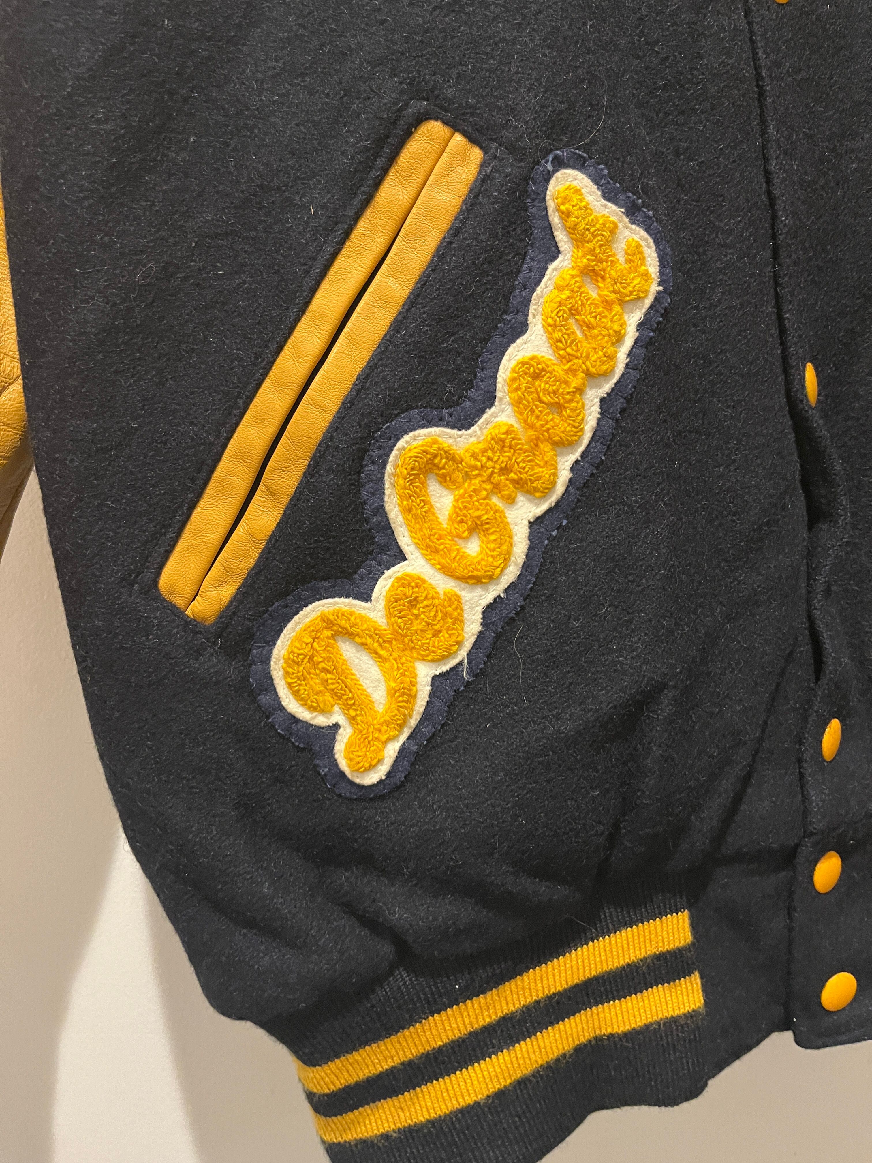 70年代〜80年代アメリカ製ホロウェイのバーシティジャケットです。ネイビー×マスタードイエローの配色がとても良い1着です。またワッペンとチェーンステッチが豪華に入り、中々スタジャンでもここまでしっかりとデザインが入るのは少ないですね。レザーもなめらかでコンディションもとても良くユニセックスでオススメなアイテムです。