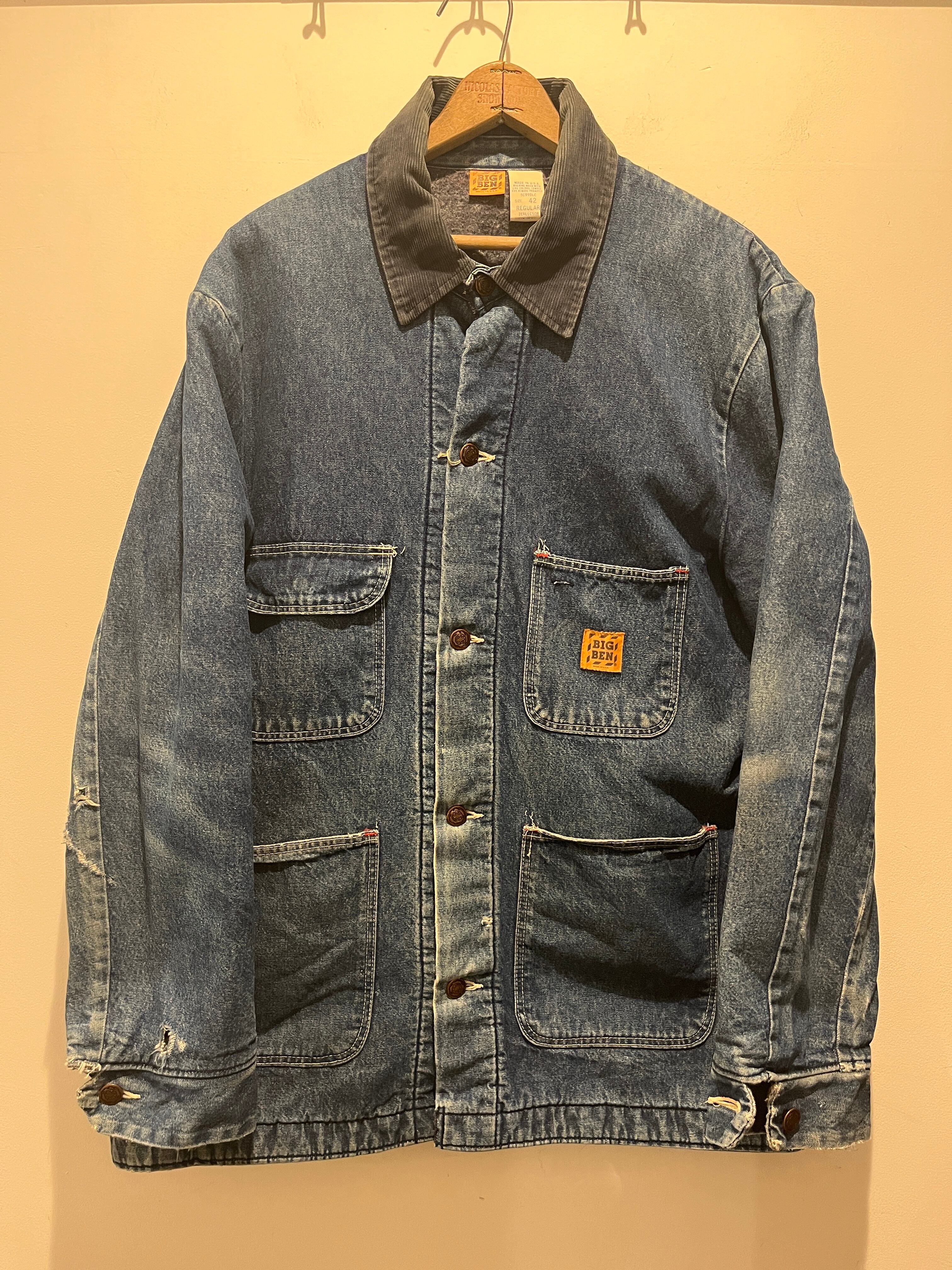 70年代〜80年代アメリカ製ビッグベンのカバーオールです。70年代から80年代のオレンジタグが付く4つポケットのデニムカバーオールとなります。襟がコーデュロイでボタンのデザインや赤のカンヌキ、袖がストームカフスと細かいディティールも良くカッコイイですね。袖の色落ち具合も良く擦れ等が雰囲気を増して、とても良い個体となっています。小さすぎず、大きすぎないサイズ感も良くオススメなカバーオール です。