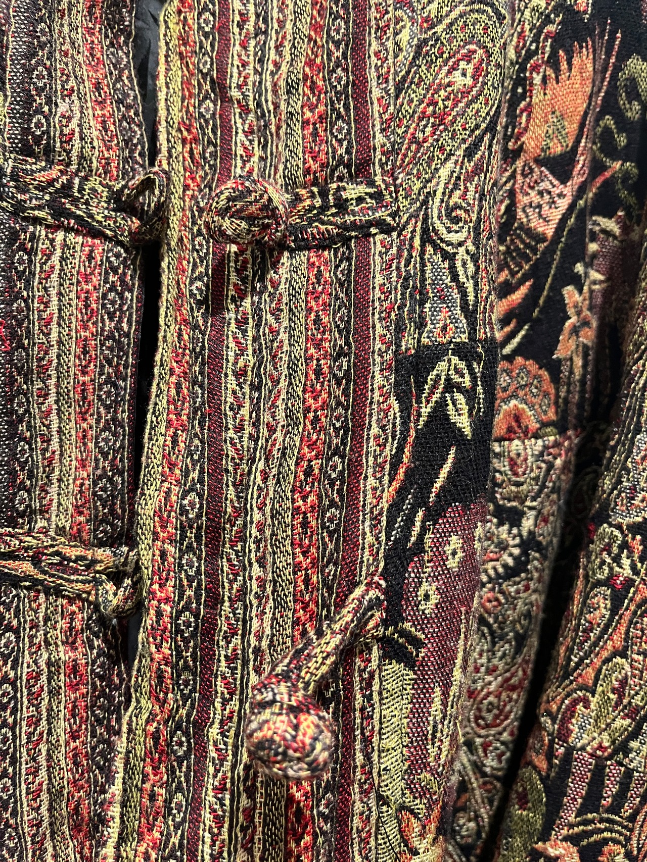 レディースホワイトスタッグのデザインジャケットです。ビンテージアイテムでも面白いアイテムが多いホワイトスタッグ。こちらはゴブラン織りのようなパッチワークの総柄×チャイナボタンと個性的かつ、お洒落な1着です。しっかり裏地もあり着用しやすくなっているのが良いですね。レディースアイテムですが小柄な男性も着用できるサイズ感でユニセックスでオススメです。