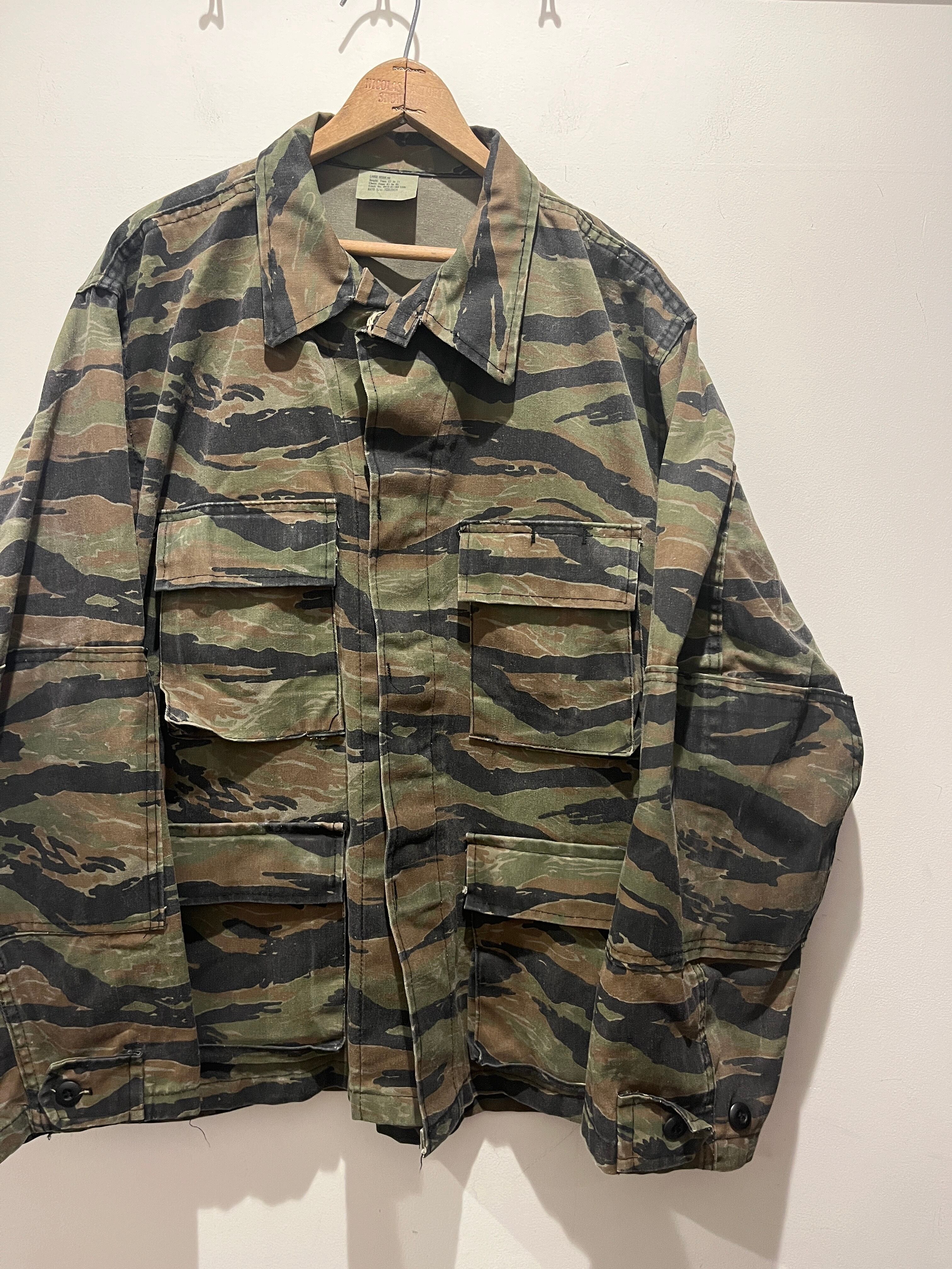 90年代タイガーカモのB.D.Uジャケットです。軍の支給品では無く民間品のタイガーカモとなりますが最近は見かけることが少なくなってきたアイテムです。4つのフラップ付きのポケットでカバーオールの様な雰囲気で着用出来るのも魅力的ですね。身幅もたっぷりでLARGEサイズと着用しやすくオススメな1点です。