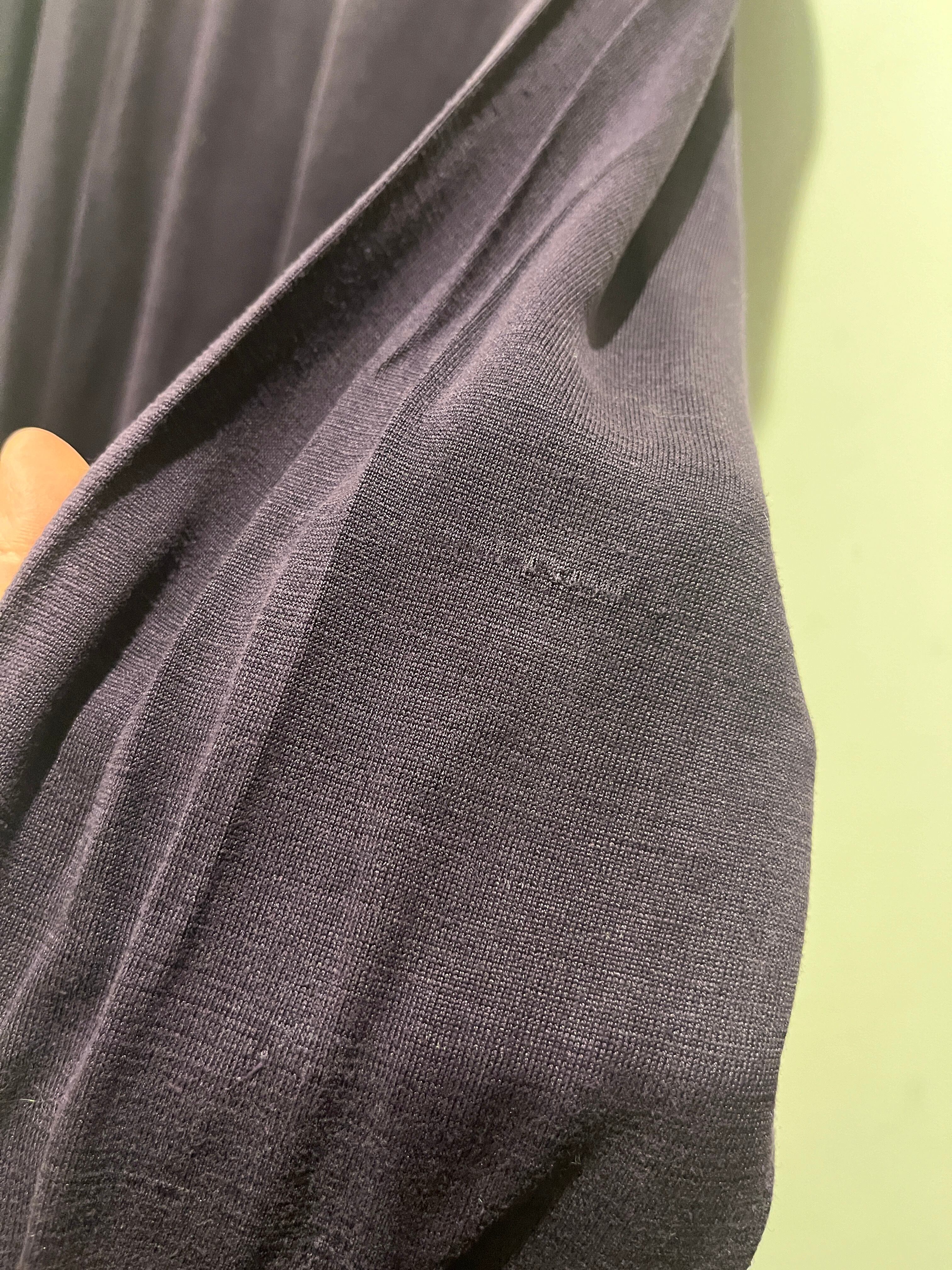 デッドストック商品ですが画像の通り、保管時の糸抜けと少しだまになってる箇所がございます。着用には問題無いコンディションとなります。