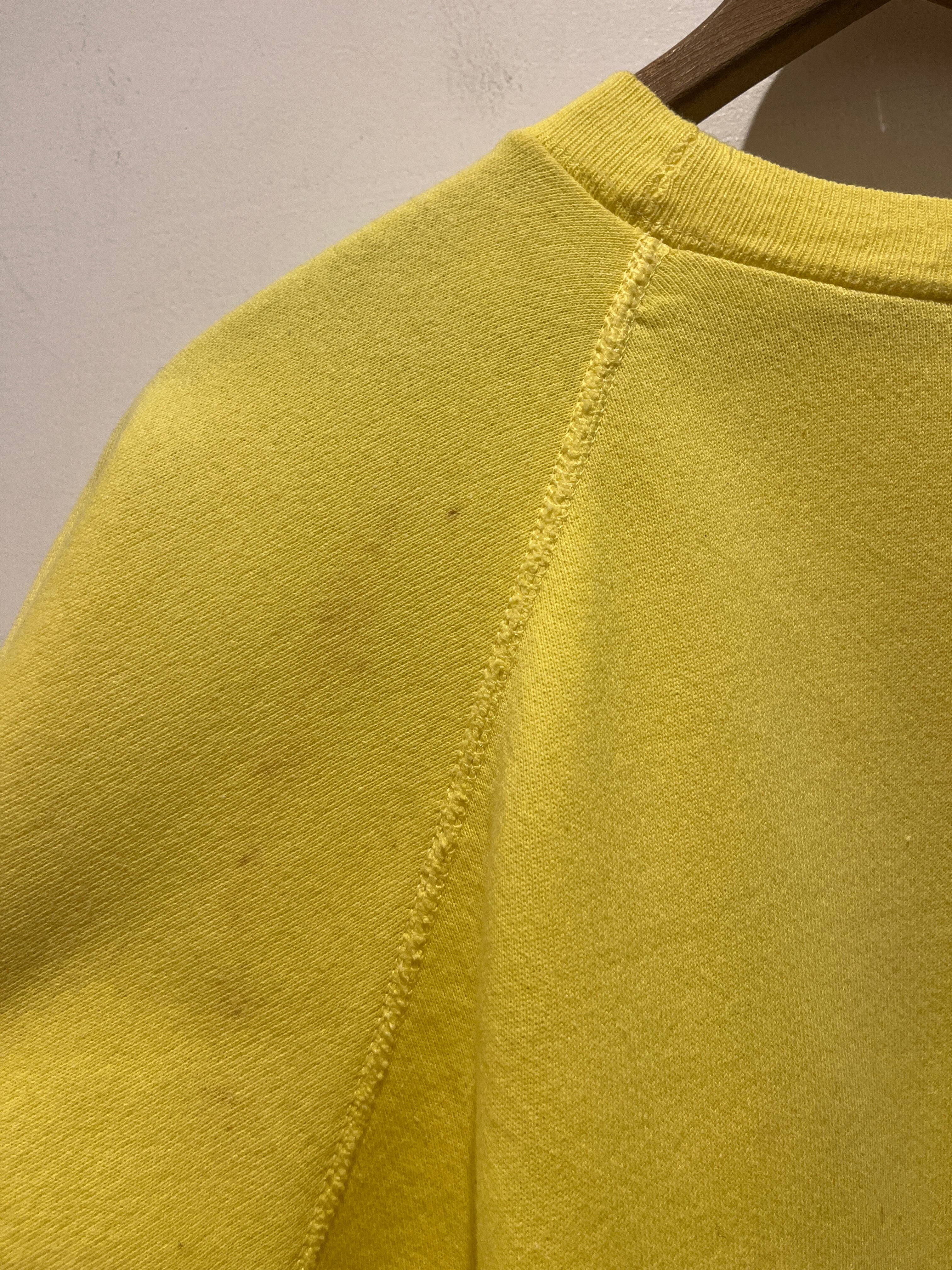 綺麗なレモンイエローにブルーのプリントの配色がとても良い1着です。アメリカ企業の物で身幅たっぷりの着丈が短めなシルエットも最高ですね。カラーリング良くユニセックスでオススメなスウェットです。
