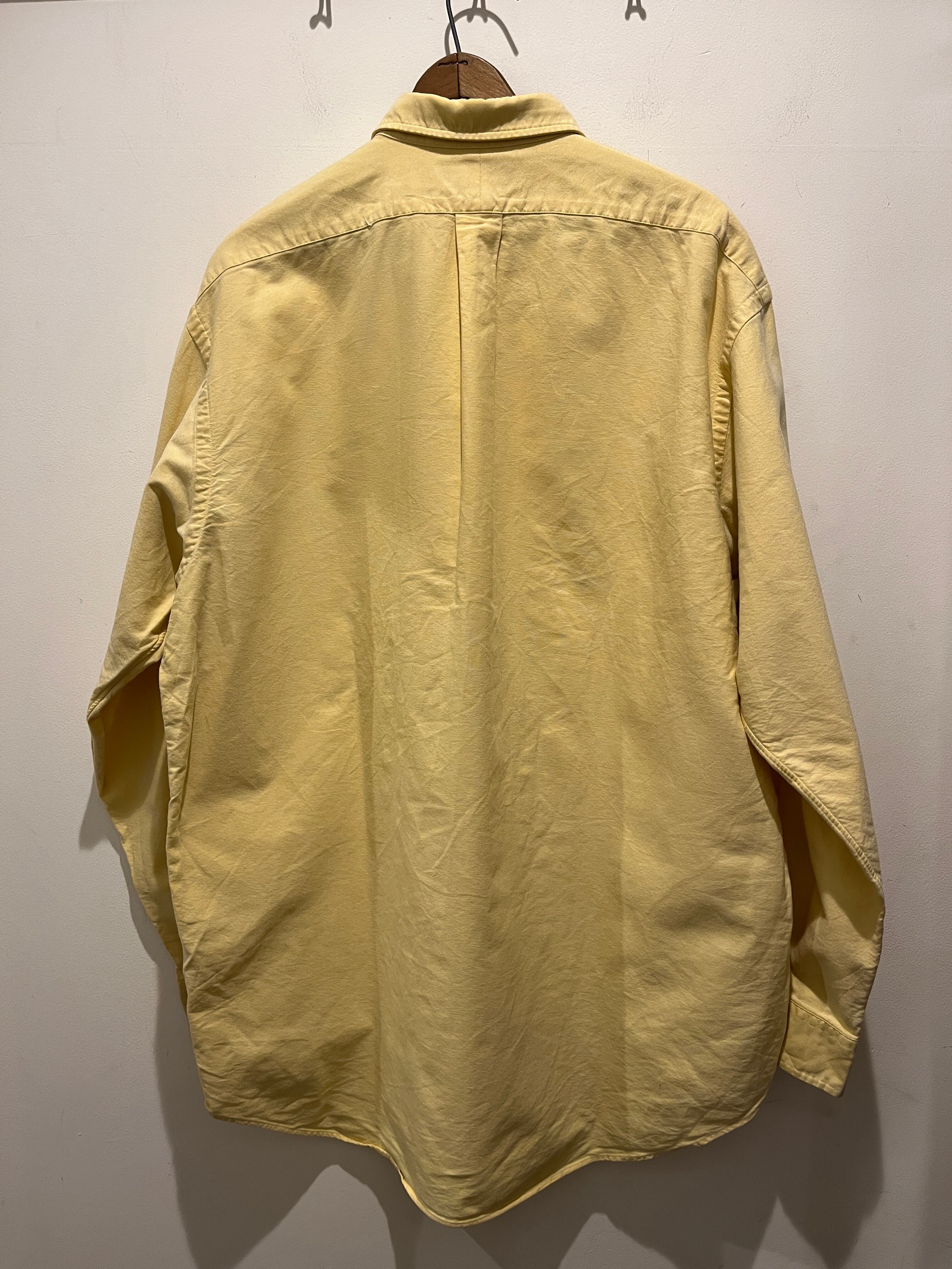 90年代ラルフローレンのシャツです。薄いイエローカラーにポニーマークが付かないタイプとなります。フラップ付きのポケットが胸に2つあるデザインがシンプルながらカッコイイですね。90年代物で作りも大きくガバッと羽織れてオススメなシャツです。