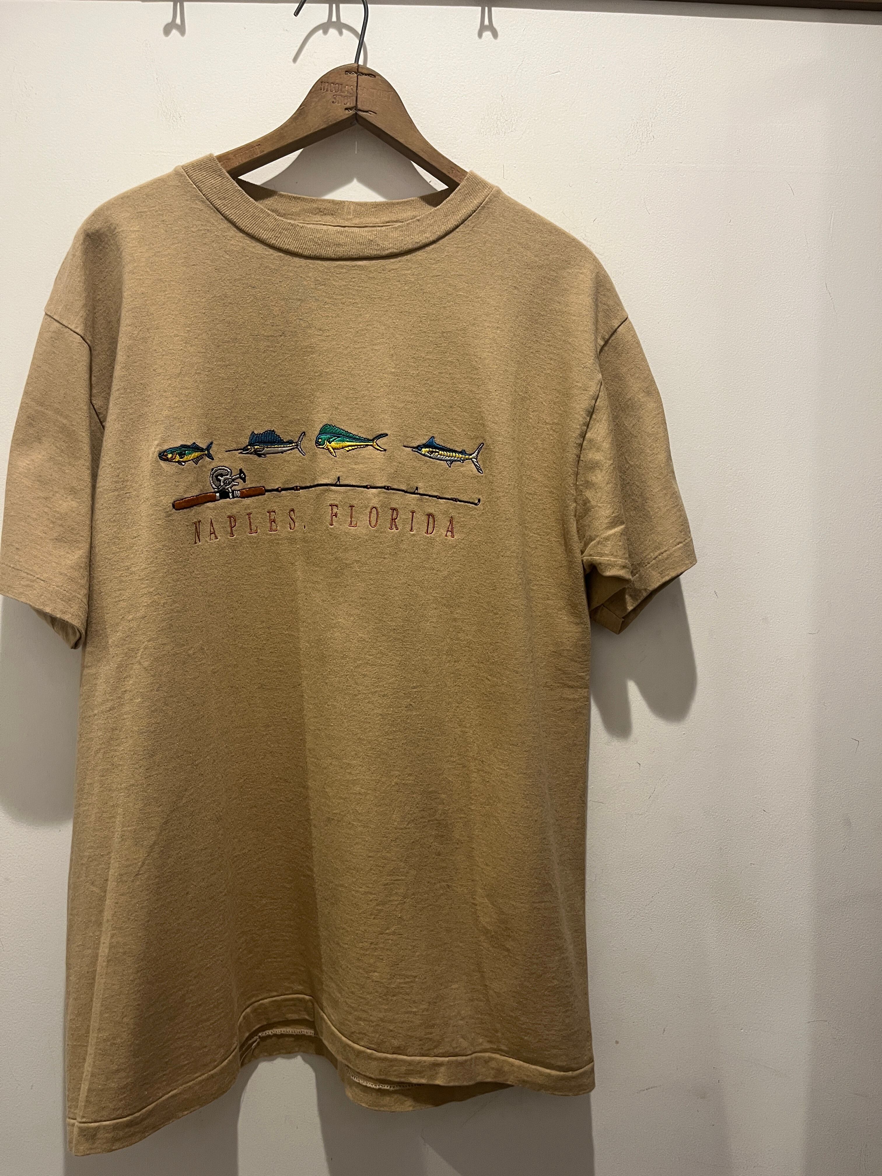 90年代アメリカ製アローレのTシャツです。1981年アメリカ設立で当時は編み立てから縫製まですべてアメリカで行っていたAlore。こちらは珍しいモカブラウンカラーに釣り刺繍がとても良い1着となります。袖、裾共にシングルステッチでコンディションも良くユニセックスでオススメなTシャツです。