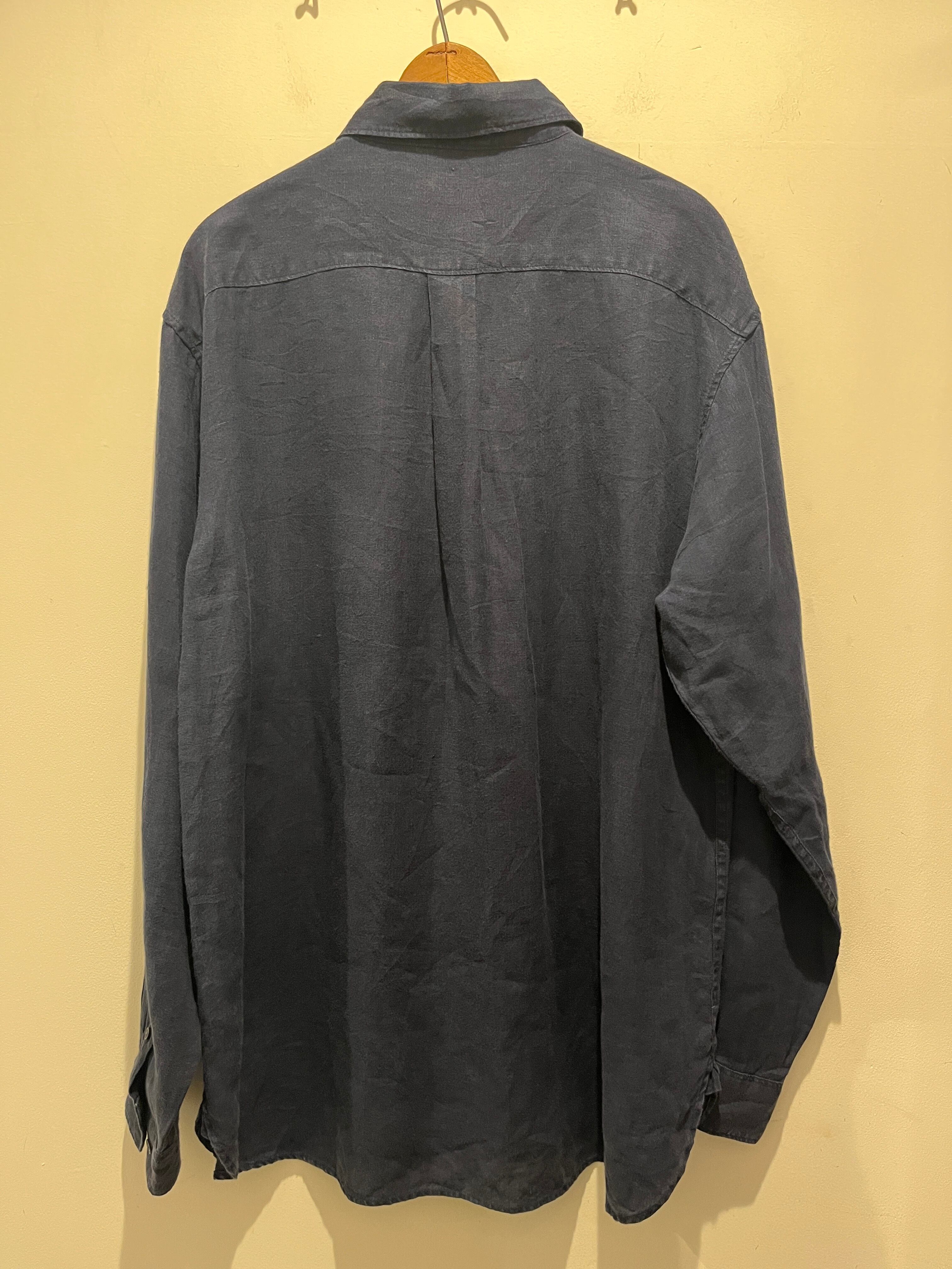 2000年ギャップのリネンシャツです。若干フェード感のあるネイビーがとても良い雰囲気の1着です。またマチがあるのもビンテージディテールが採用されていてとても良いですね。2000年11月製造のGAP製品となります。プルンプルンな生地感でゆったりめなサイズ感と肩の落ち感もありユニセックスでオススメなアイテムです。
