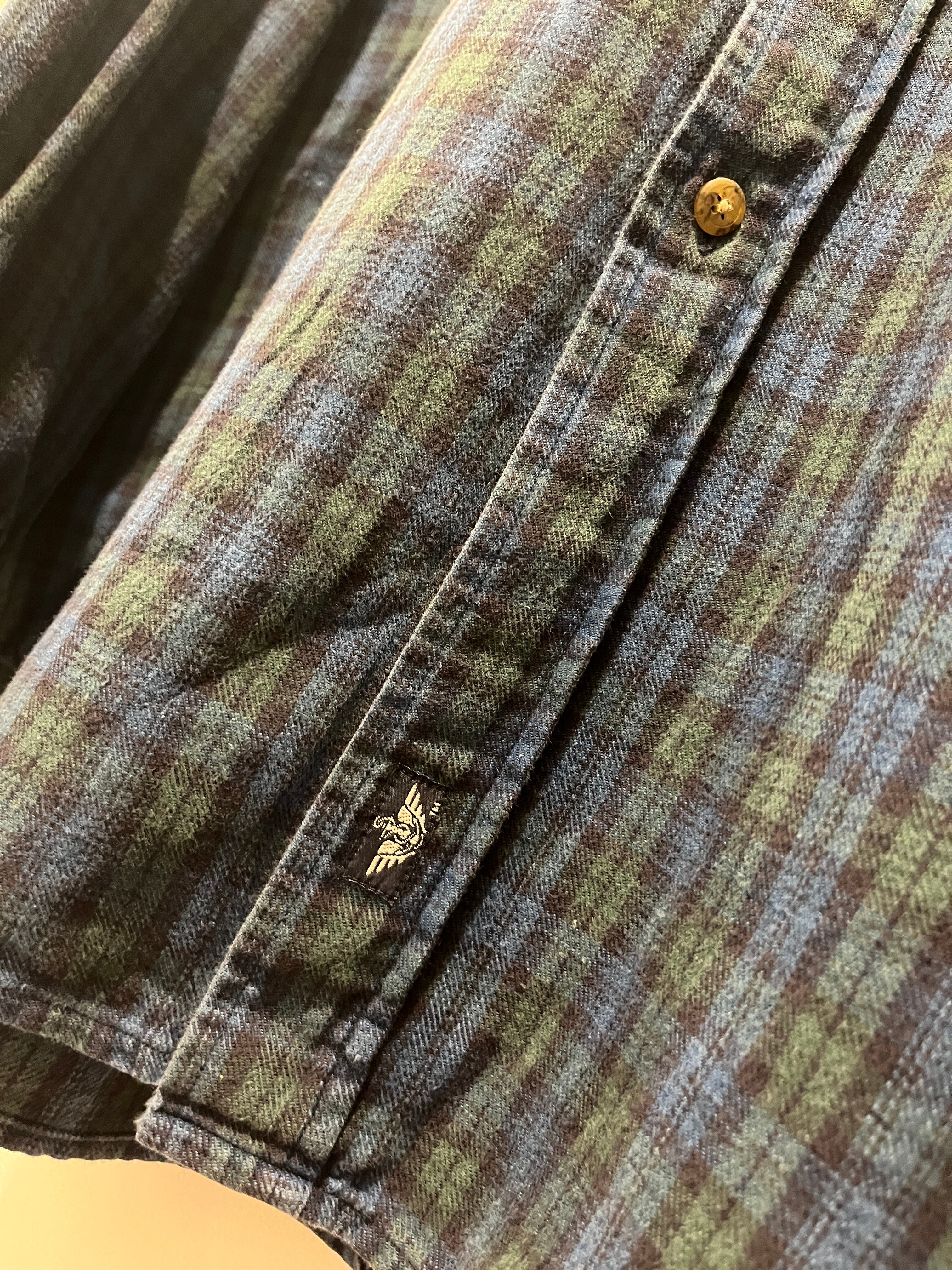 90年代ドッカーズのバンドカラーチェックシャツです。ブラックウォッチの様な色味となりますがインディゴコットンなのでデニム同様に色落ちや経年変化を楽しめるシャツとなっております。バンドカラーでインディゴコットンとありそうで中々無く、身幅もたっぷりなシルエットとオススメな1着です。