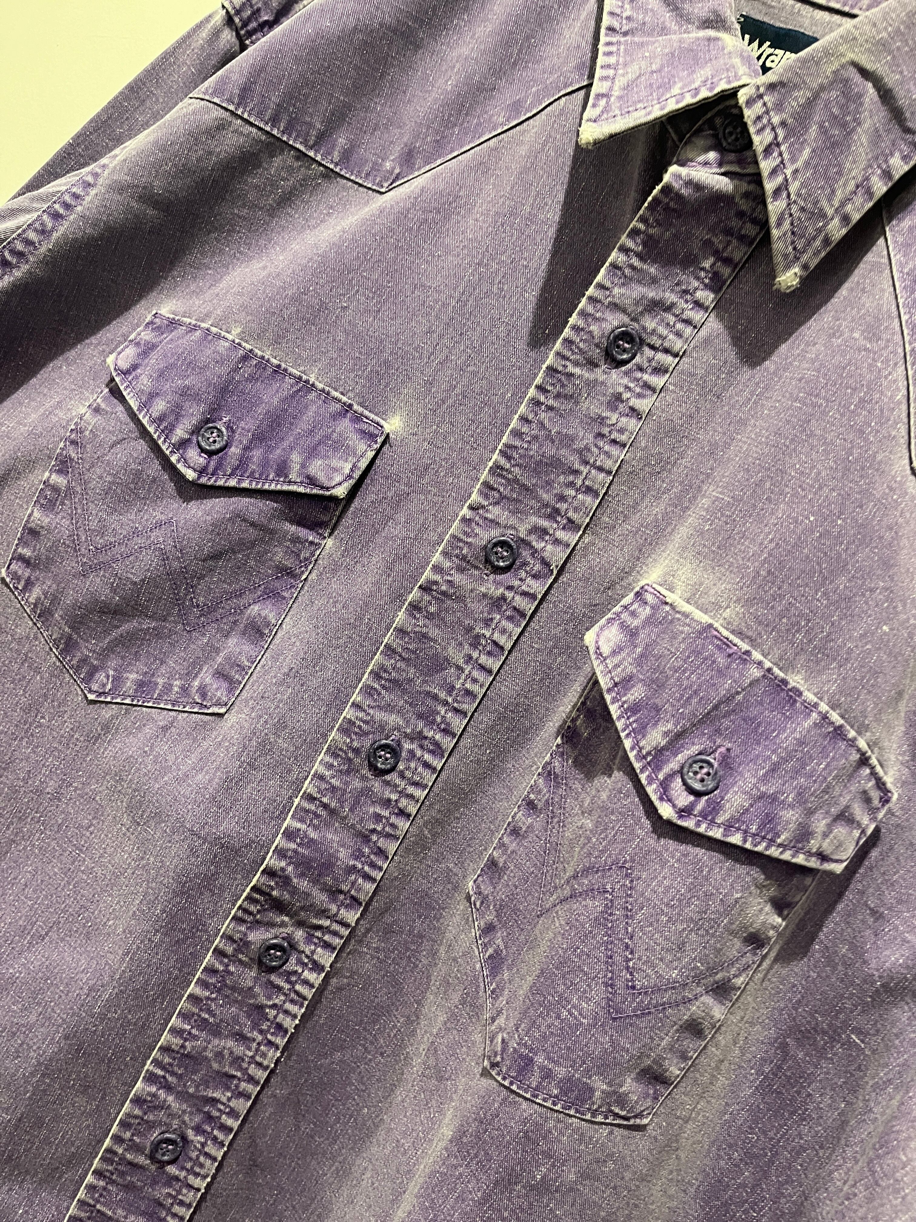80年代アメリカ製ラングラーの紫デニムシャツです。珍しいパープルデニムのラングラーのシャツとなります。色落ち感も良くアタリなどもでていて雰囲気ある1着となります。80年代物なので襟が大きすぎ、身幅も細すぎないのが着やすいですね。ブラックのパンツ等と相性良くオススメです。