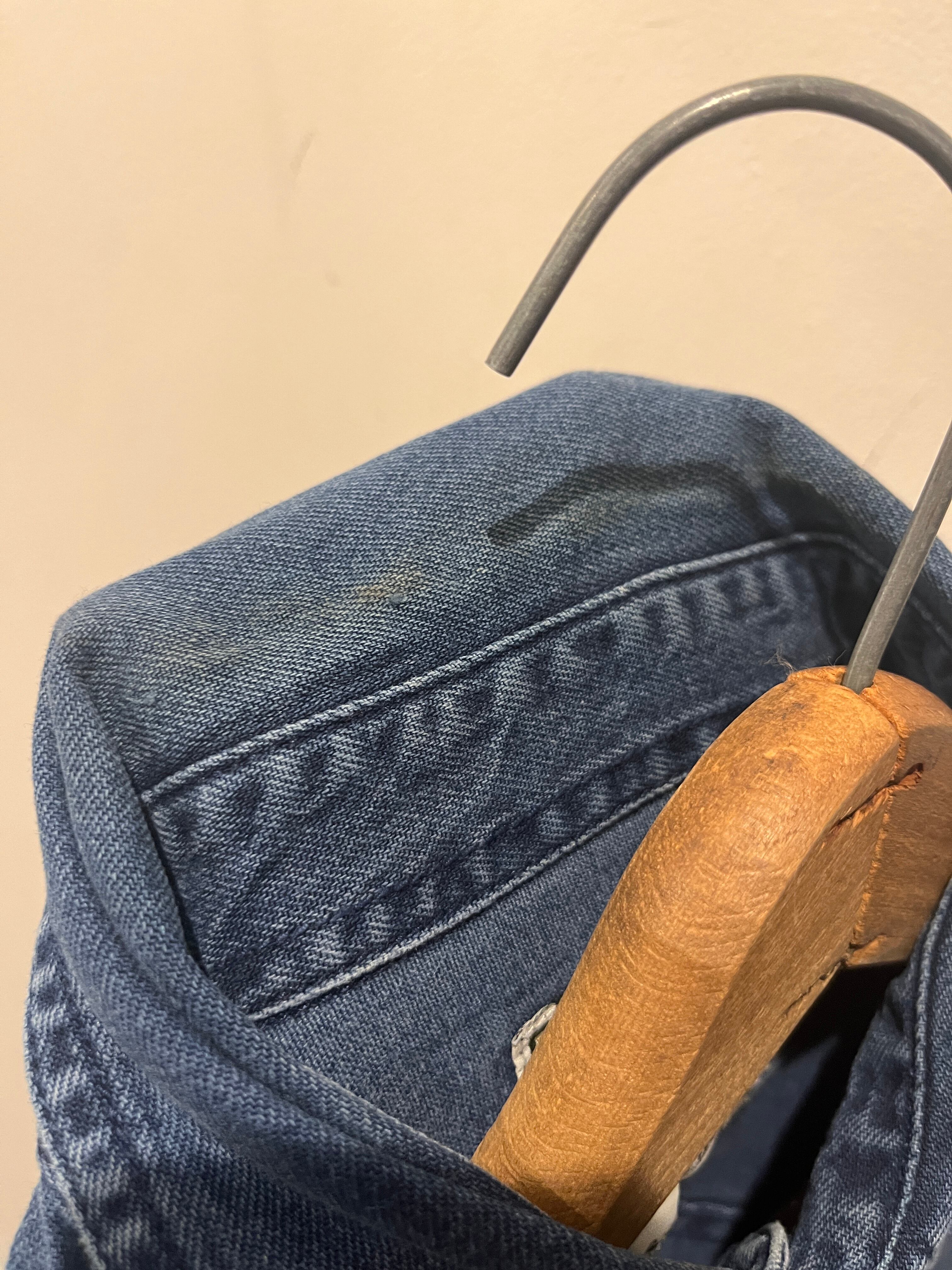 90年代リーバイスデニムシャツです。フロント2ポケットでボタンもデニムパンツなどで使われる小ボタンがアクセントになっている1着です。デニムですが生地感も柔らかく着心地も最高です。Mサイズ表記ですが大きめな作りでコンディションも良く、ユニセックスでオススメです。