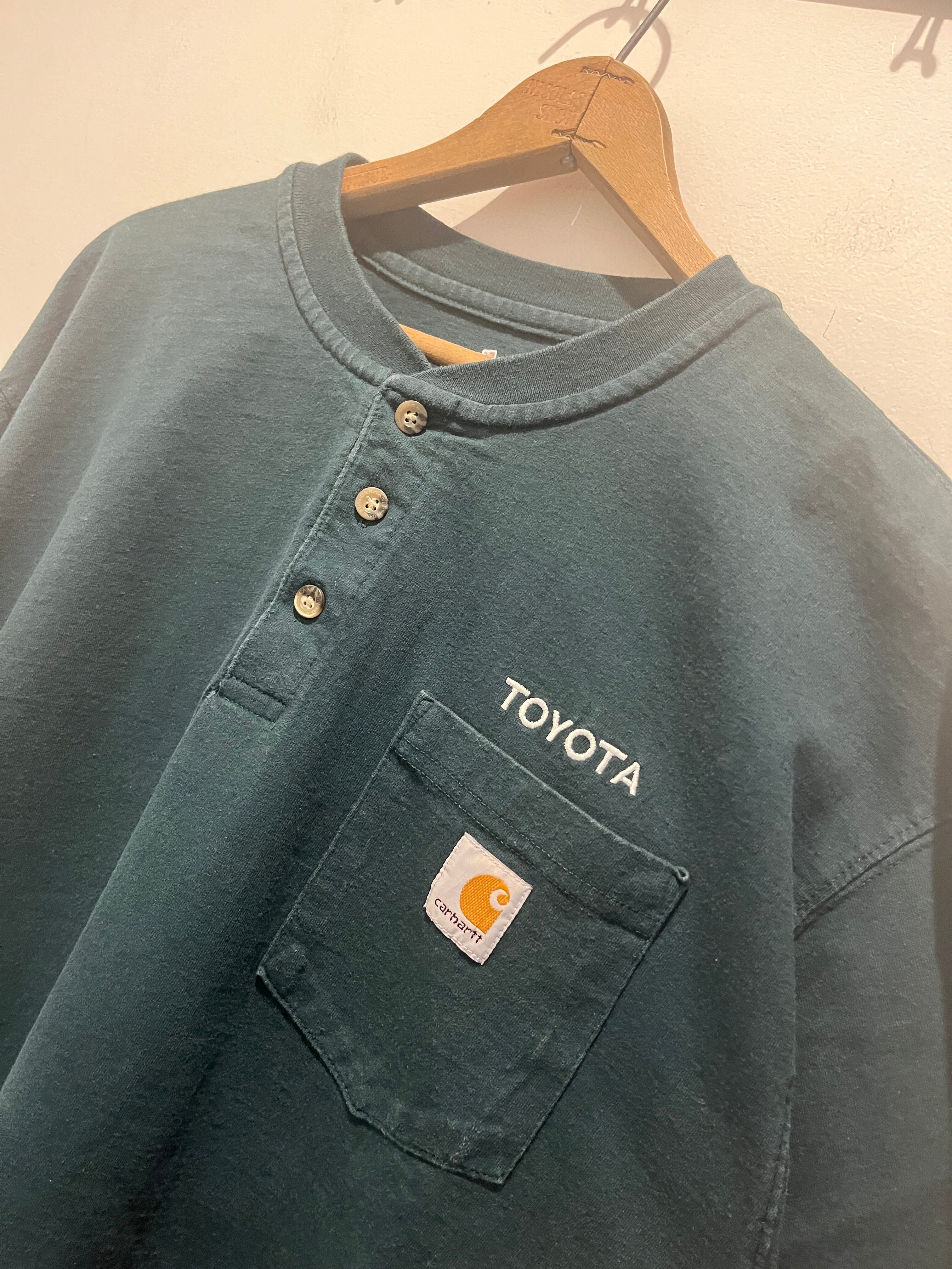 US企画カーハートのロングスリーブTシャツです。グリーンボディにヘンリーネック仕様のポケット付きとなります。またTOYOTAの企業刺繍が希少性もありポイントですね。アメリカ企画のカーハートとサイズも少し大きめでゆったり着用できオススメです。