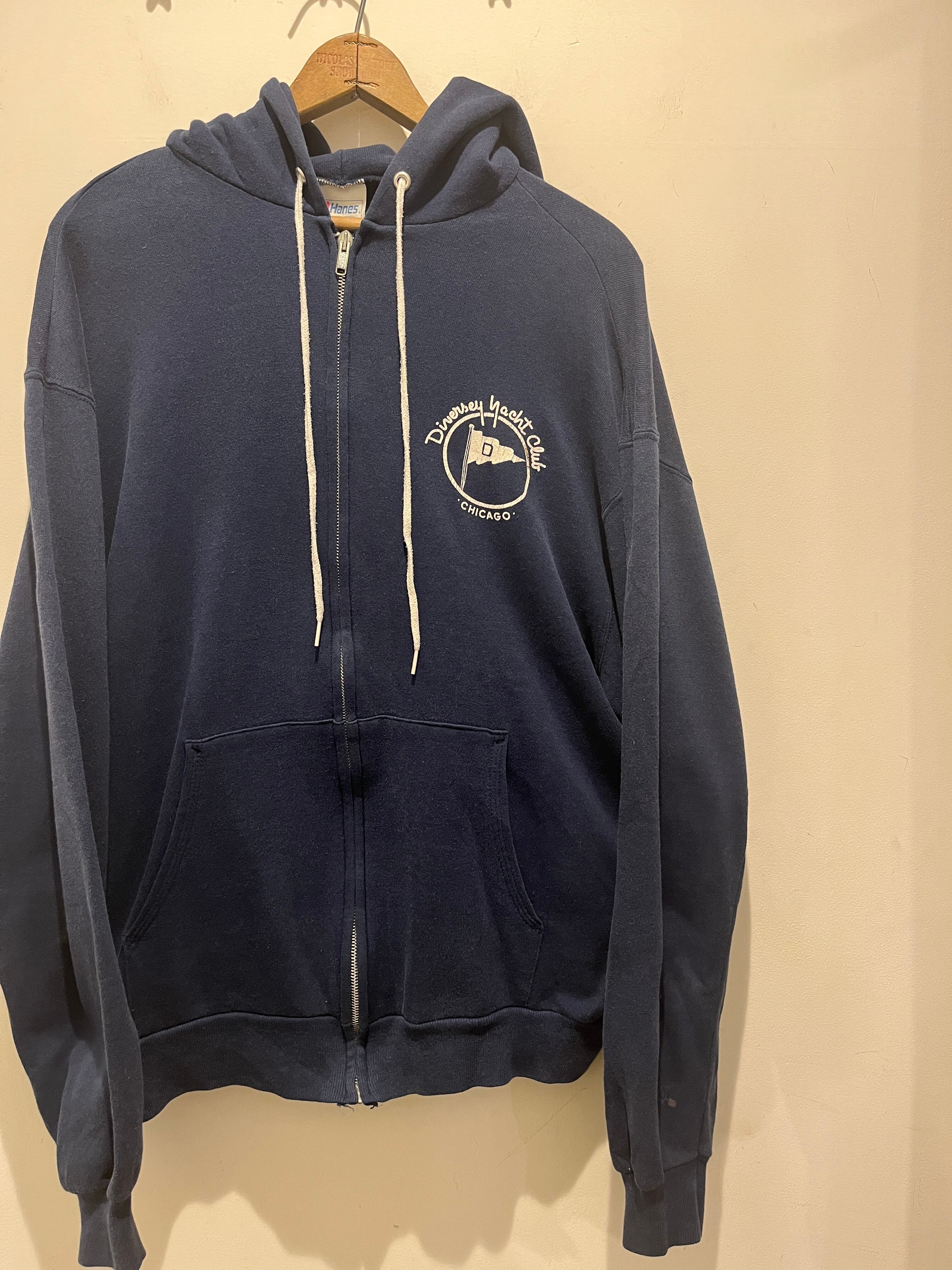 80年代アメリカ製ヘインズのジップパーカーです。ネイビーボディで胸にラバープリントのシンプルなデザインがとても良いですね。IDEALのアルミジッパーにフェードしたネイビーがまた最高ですね。厚すぎない生地感でサラッと着用でき、XLとゆったり目なサイズ感も良くオススメな1着です。