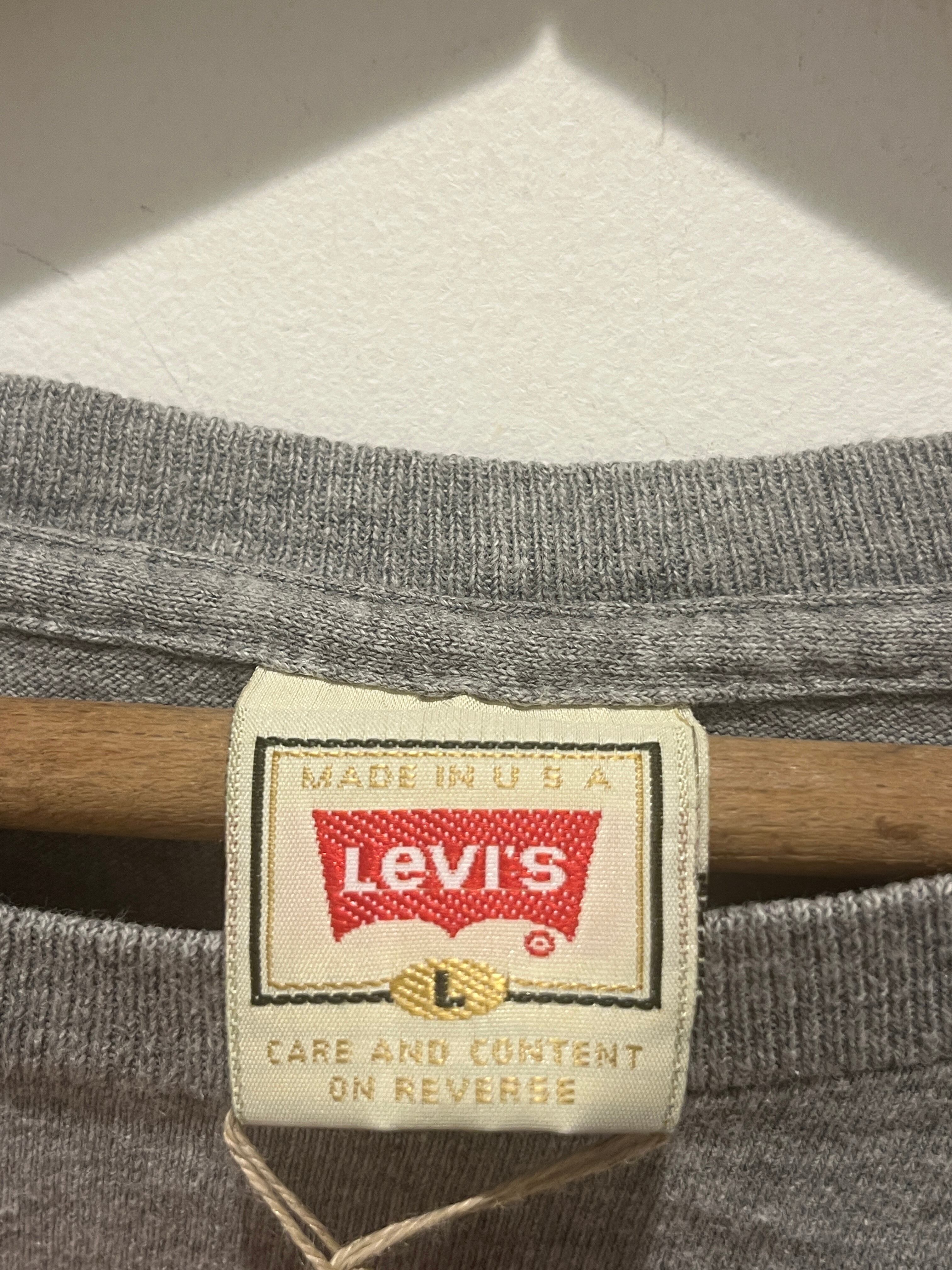 90年代アメリカ製リーバイスのTシャツです。グレーボディでサイドにプリントがある珍しいリーバイスTシャツとなります。このデザインは中々見かけませんね。袖、裾共にシングルステッチ仕様となります。ボックスシルエットで着用しやすくアメリカ製リーバイスとオススメなTシャツです。