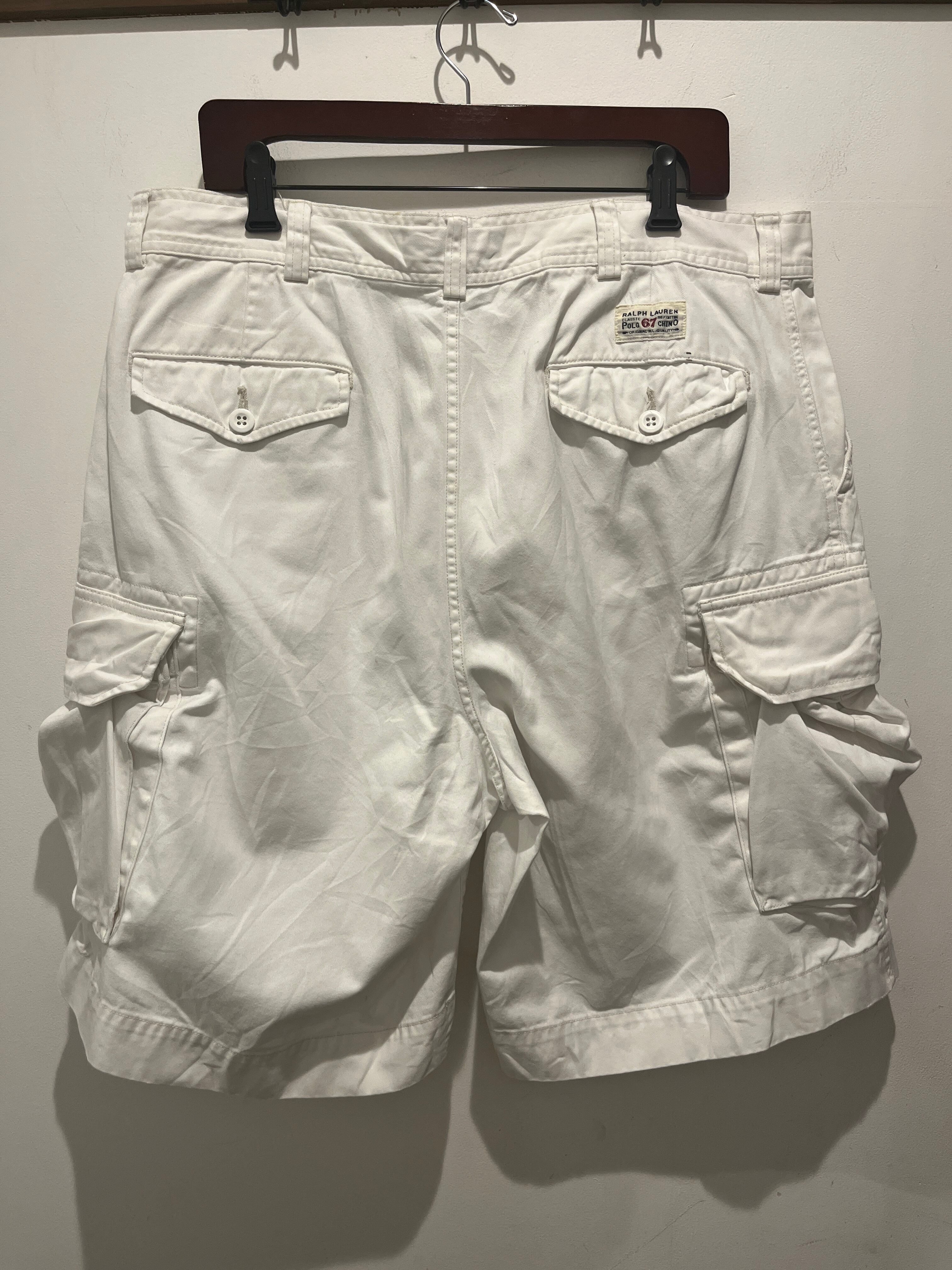 ラルフローレンのショートパンツです。オフホワイトカラーのカーゴタイプとなります。ベージュは良く見ますがオフホワイトはあまり見ませんね。ボタンも白で統一されてるのがとても良く、程良い長さがあるのも良いですね。ベルトで絞って履いてもかっこ良くオススメな1本です。