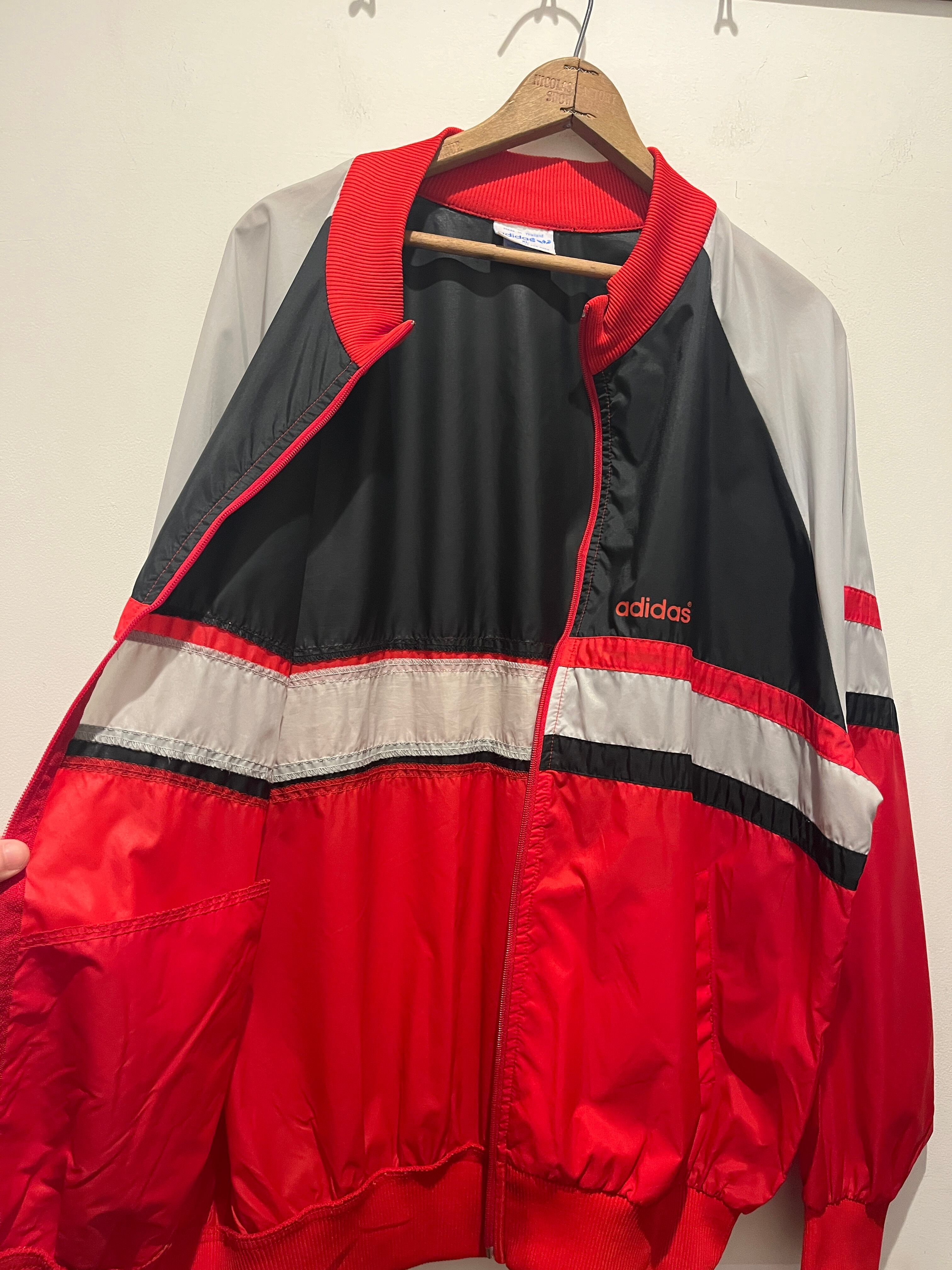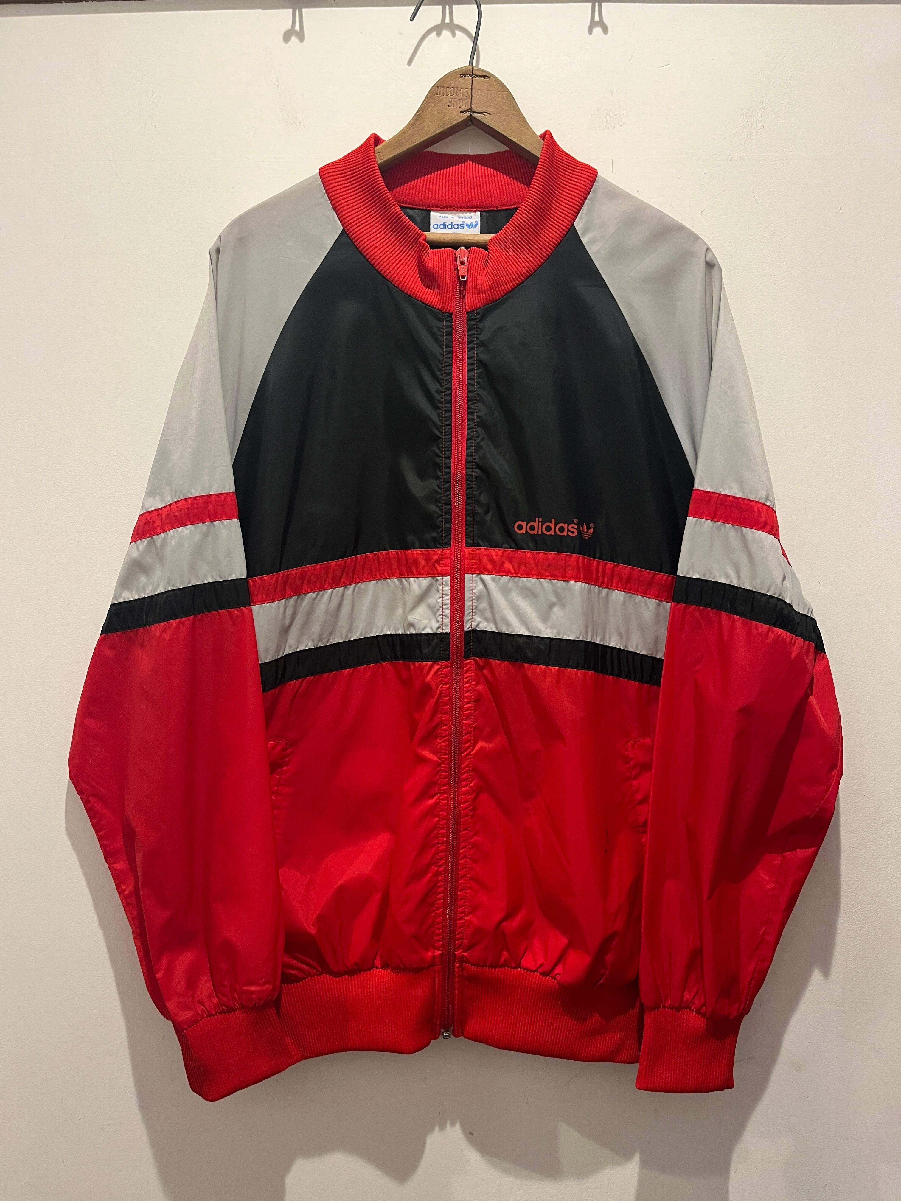 80年代アディダスのナイロンジャケットです。レッド×ネイビー×グレーの配色でトラックジャケットにある形のナイロンジャケットとなります。コンパクトにもなり薄手で雨の日なんかにも最適ですね。この年代の物ですと小さいサイズ感が多い中、XLの大きめなサイズ感とオススメな1着です。