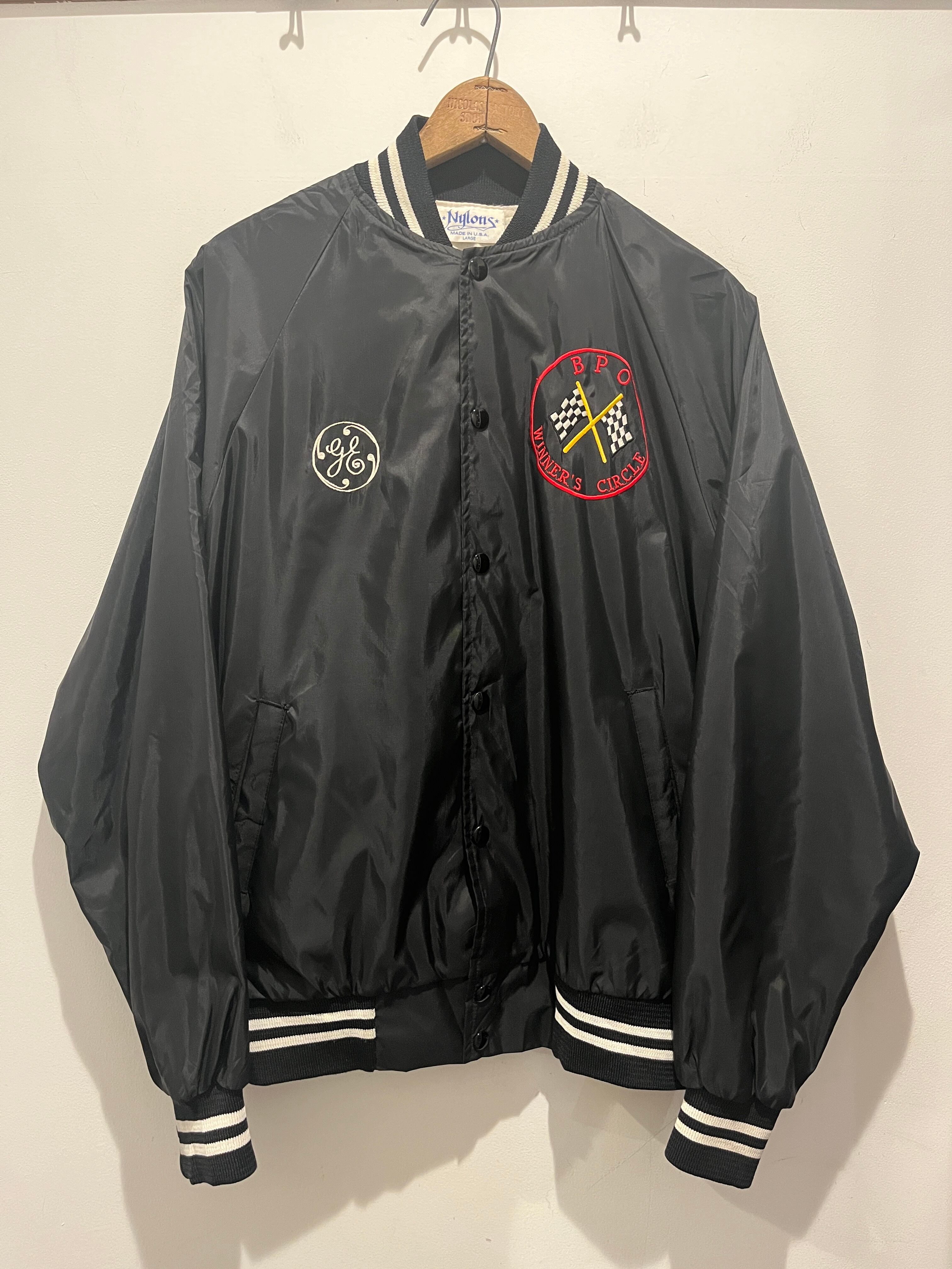 70年代〜80年代アメリカ製のナイロンスタジャンです。ブラックボディのナイロンスタジャンでリブもブラック×ホワイトのモノトーンがまた良いですね。胸にチェッカーフラッグの刺繍などデザインもバッチリです。着丈短めで軽く羽織れるアイテムとしてオススメです。