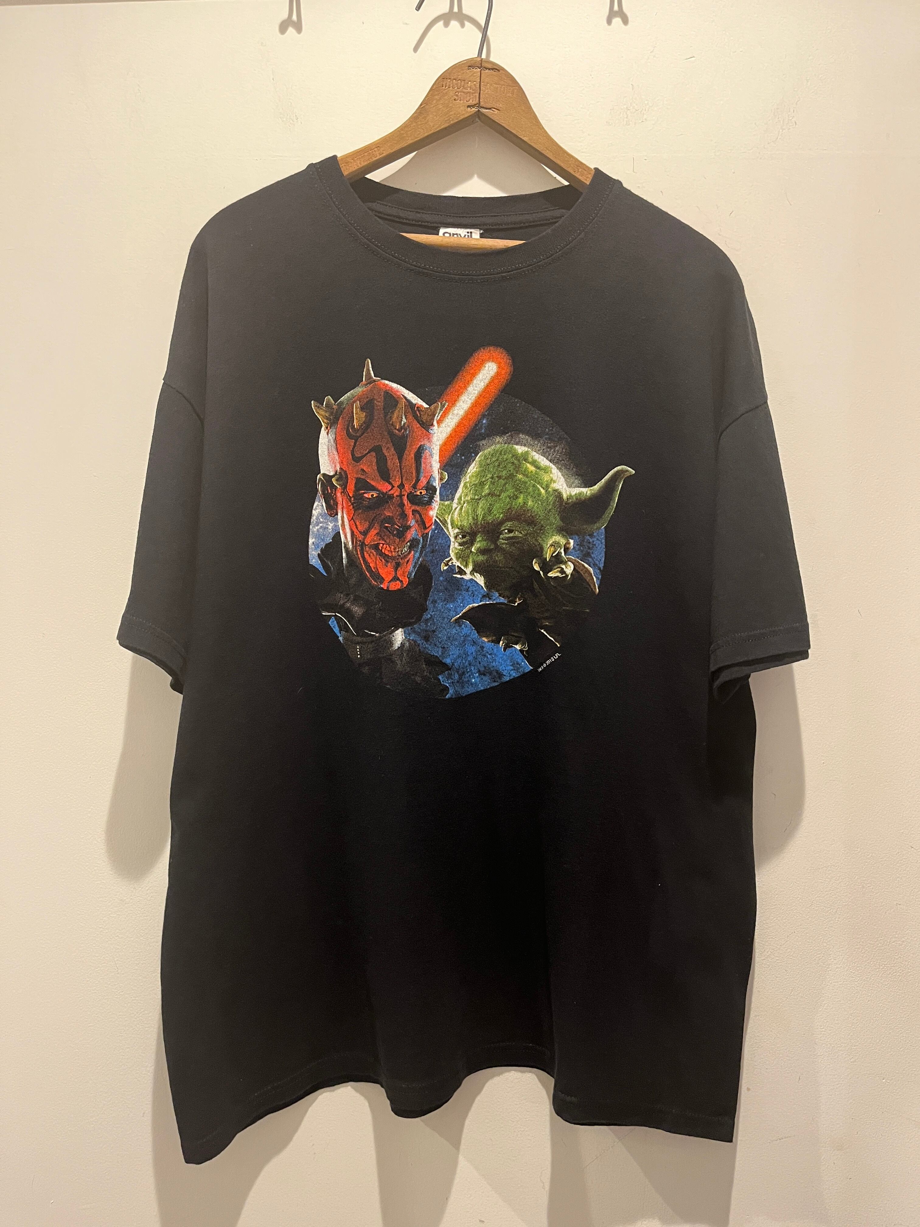 2012年スターウォーズ エピソード1 3DのプリントTシャツです。ブラックボディにダースモールとヨーダのプリントがとても良い1着です。3Dの方なので年代はまだ浅いですが映画Tシャツはやはり人気が高いですね。2012年のコピーライト入りで袖、裾共にダブルステッチとなります。コンディションも良く100%コットンのXLサイズとオススメな1着です。