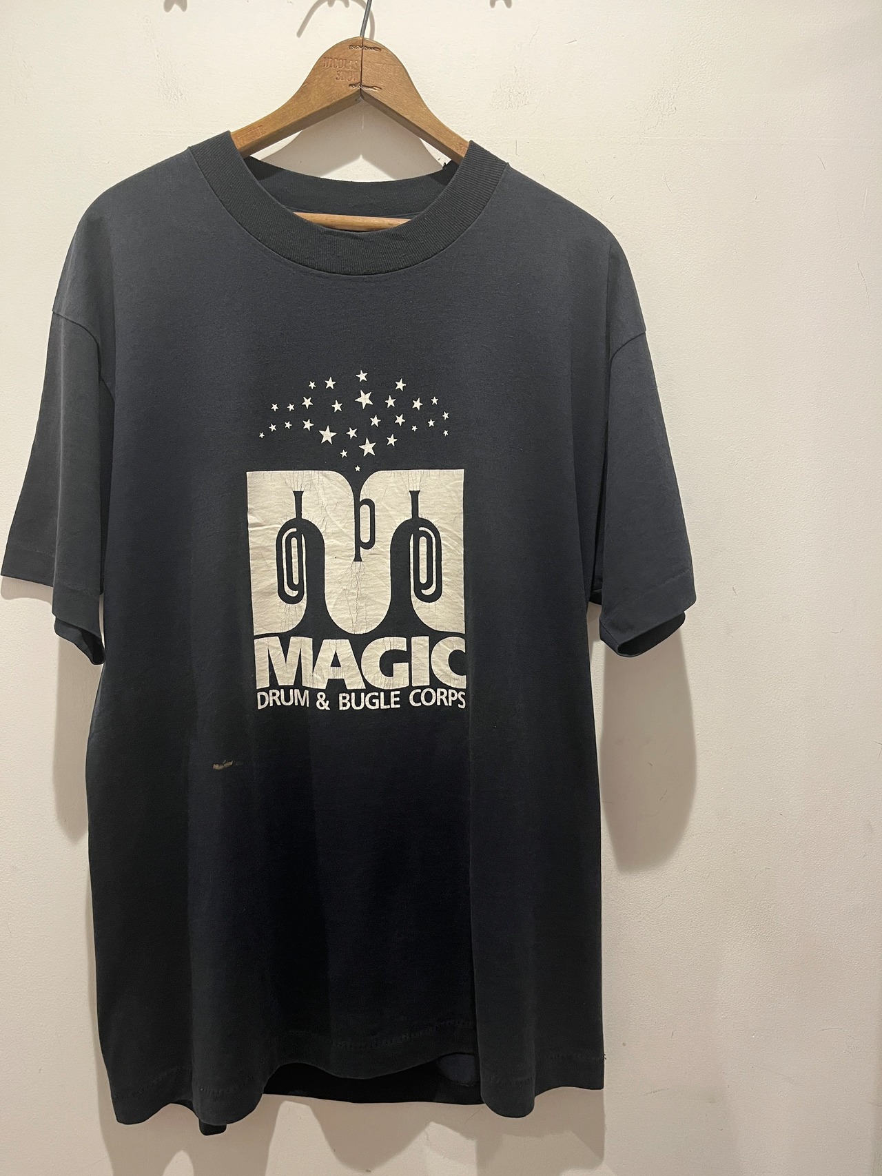 90年代アメリカ製スクリーンスターズのプリントTシャツです。ブラックボディにホワイトのラバープリントで当時アメリカにあったマーチングバンドの物となります。袖、裾共にシングルステッチです。フェードしたブラックボディにヒビ割れたプリントも雰囲気ありオススメなTシャツです。