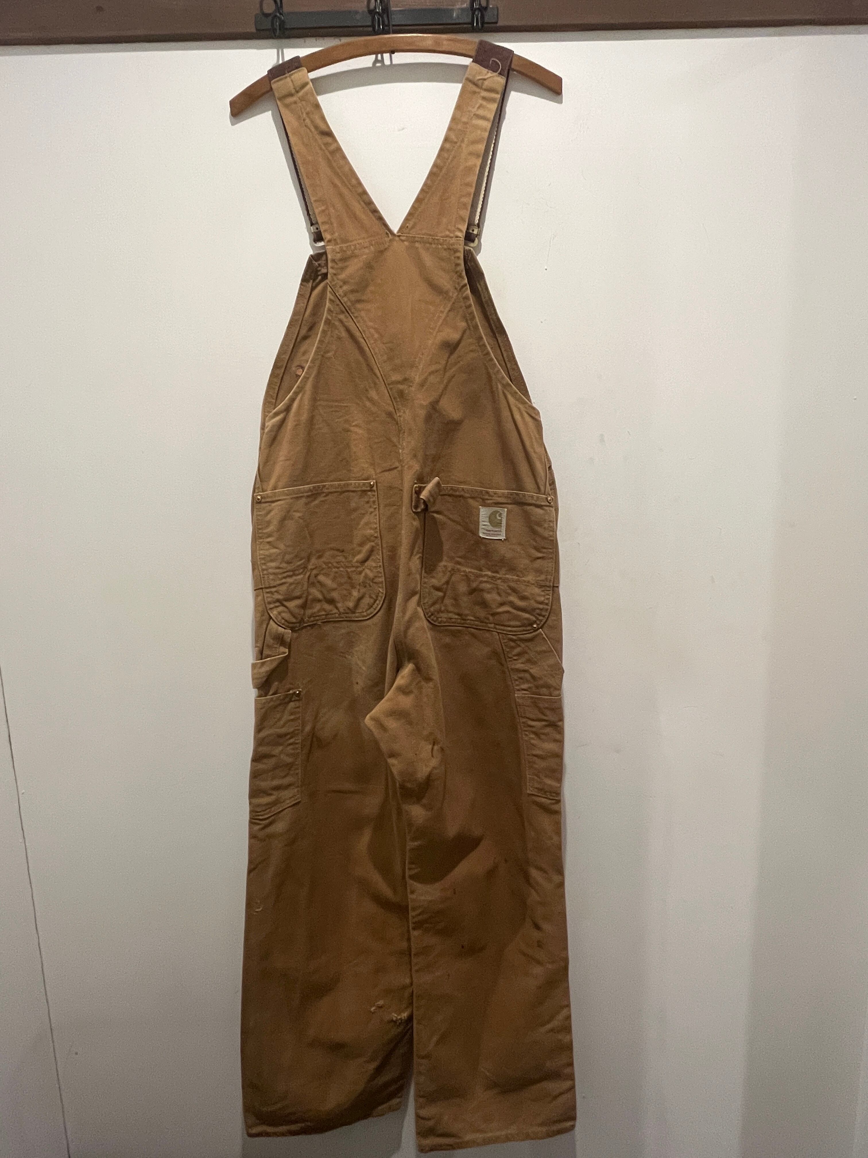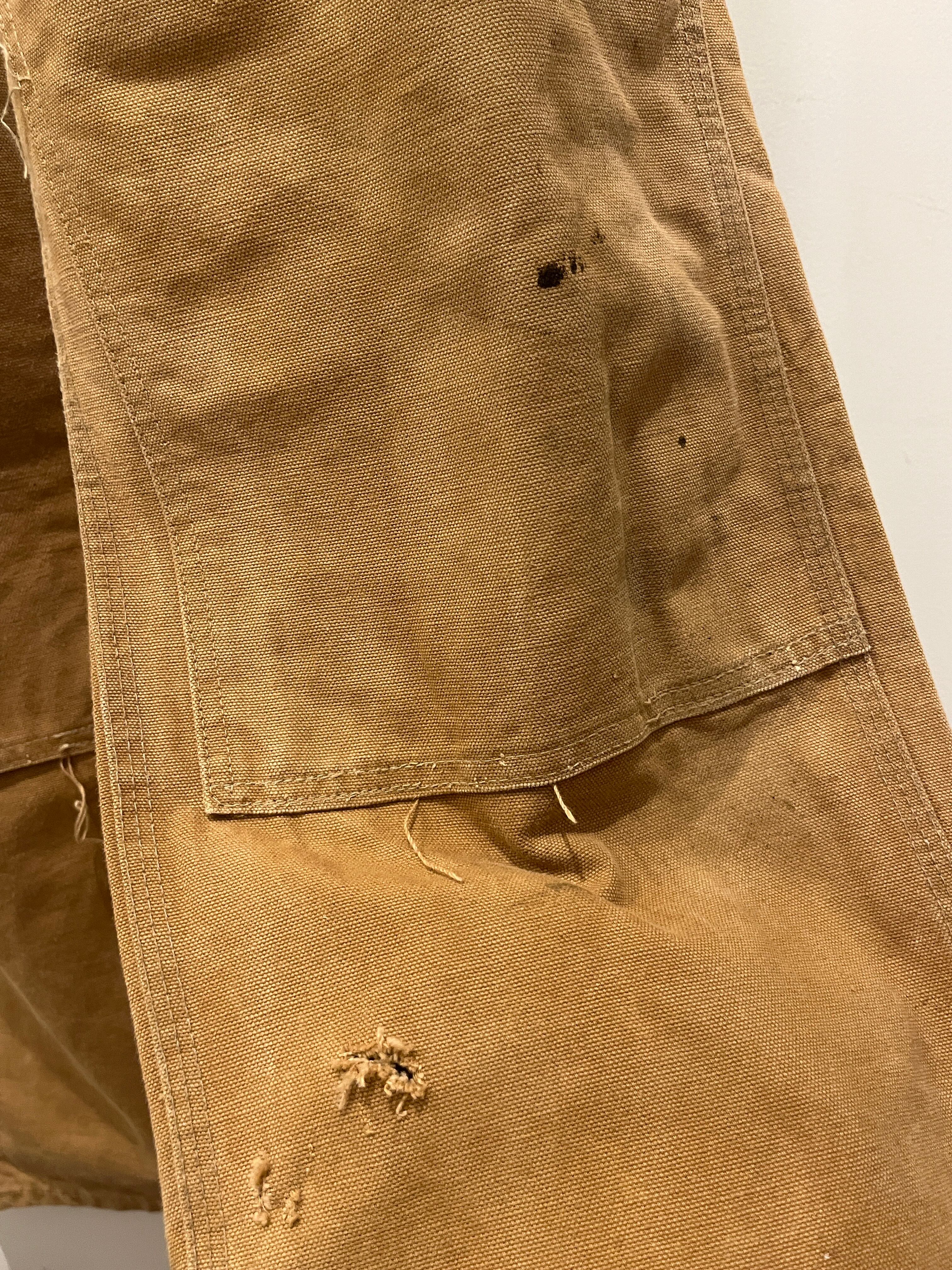 60年代〜70年代アメリカ製カーハートのダックオーバーオールです。定番のブラウンダックでダブルニー仕様のフロント山ポケがとても良いですね。オイルジミやフェードなどリアルワークな雰囲気が最高です。少し小さめなサイズなのでジャストで着用したい男性か女性な方にもオススメなオーバーオールです。