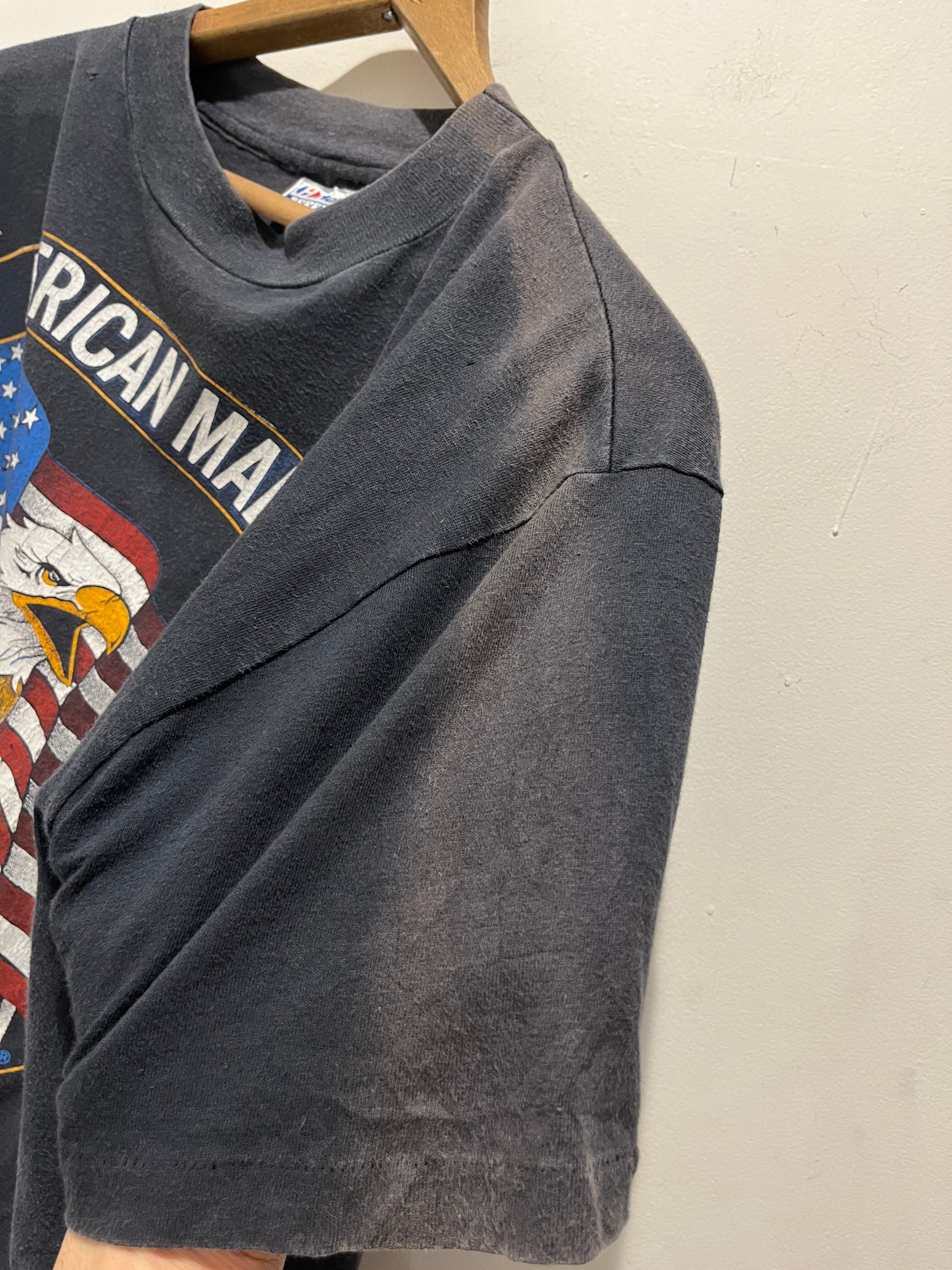 80年代のアメリカ製ハーレーTシャツです。ブラックボディでフロントとバッグ共に最高なデザインです。ヘインズのBEEFYボディで袖、裾共にシングルステッチです。フェードしたブラックボディが雰囲気抜群でこの年代のハーレーTも少なくなってきておりオススメな1点です。