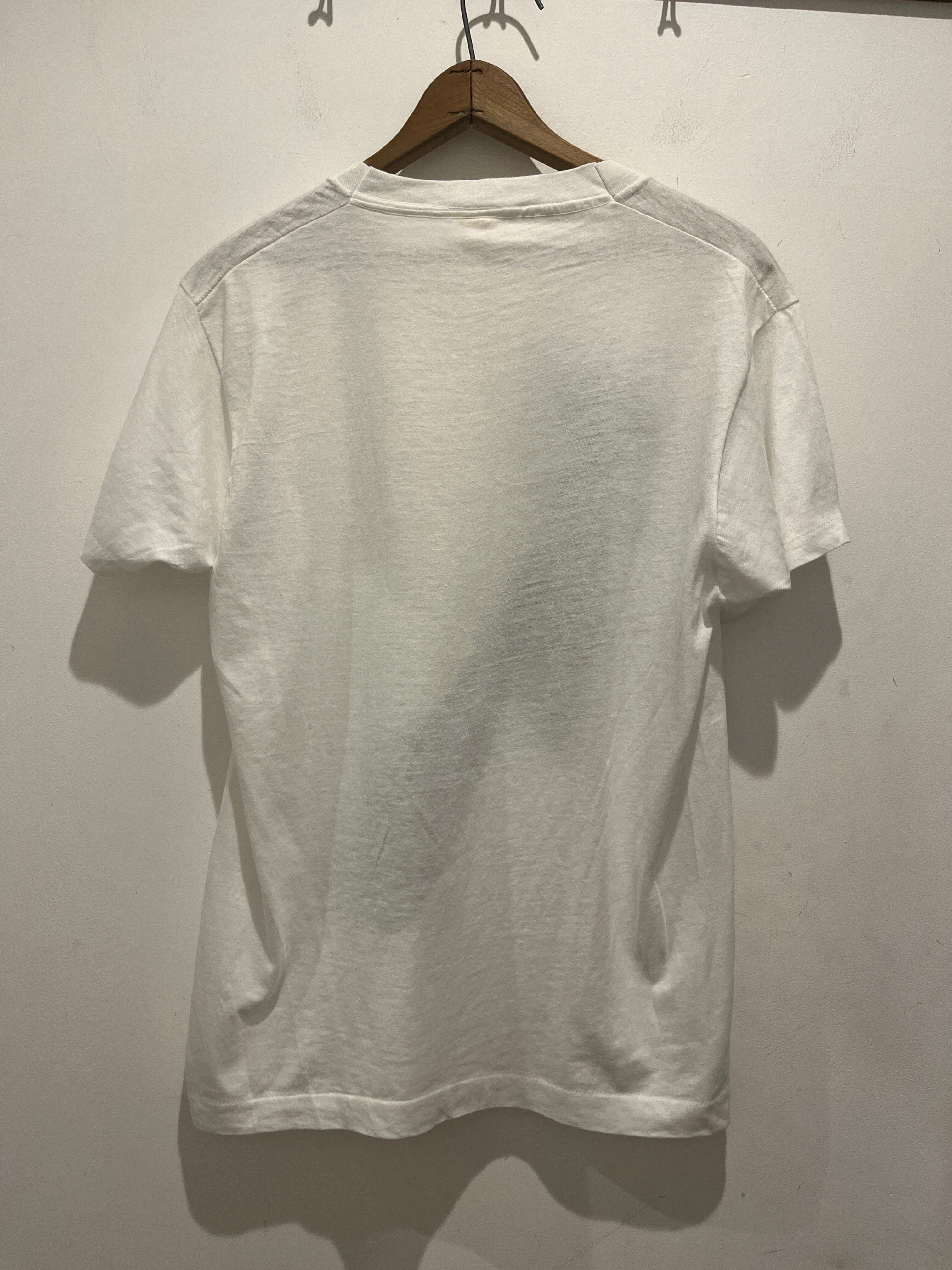 80年代アメリカ製スクリーンスターズのTシャツです。白ボディに自由の女神の手がハンドプリントされているアートな1着です。手だけのデザインがシュールかつインパクトありますね。袖、裾共にシングルステッチです。80年代とサイズ感も大きくないのでユニセックスでオススメなTシャツです。