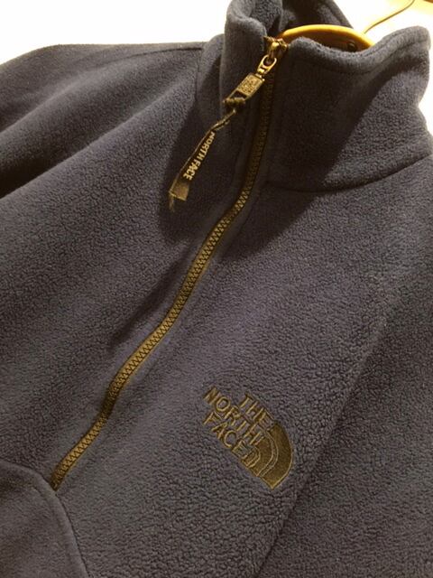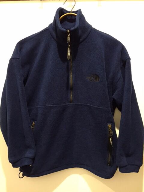 カラーはダークブルーです。フリースはポリエステルを使用しポーラテック社の物で速乾性に優れています。軽くて暖かいのもポイントですね。黒タグのノースフェイスは最近になって人気が出て来ています。ハーフジップでサイドにジップ付きのポケットがあるのも嬉しいポイントですね。裾にはドローコードも付いているので絞る事も可能です。女性か小柄な男性にオススメなサイズ感です。