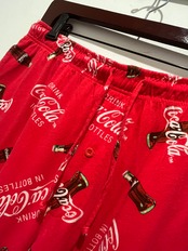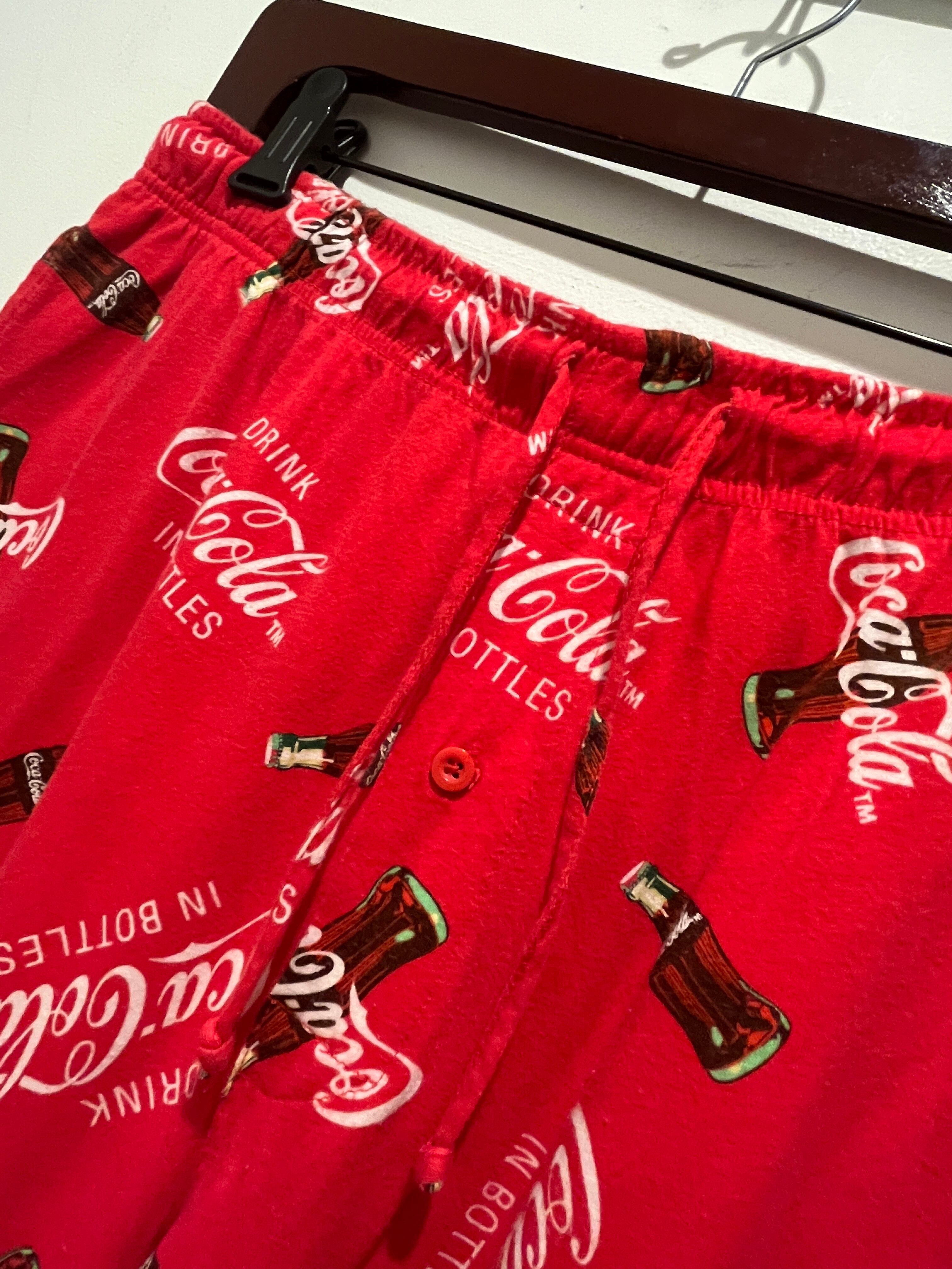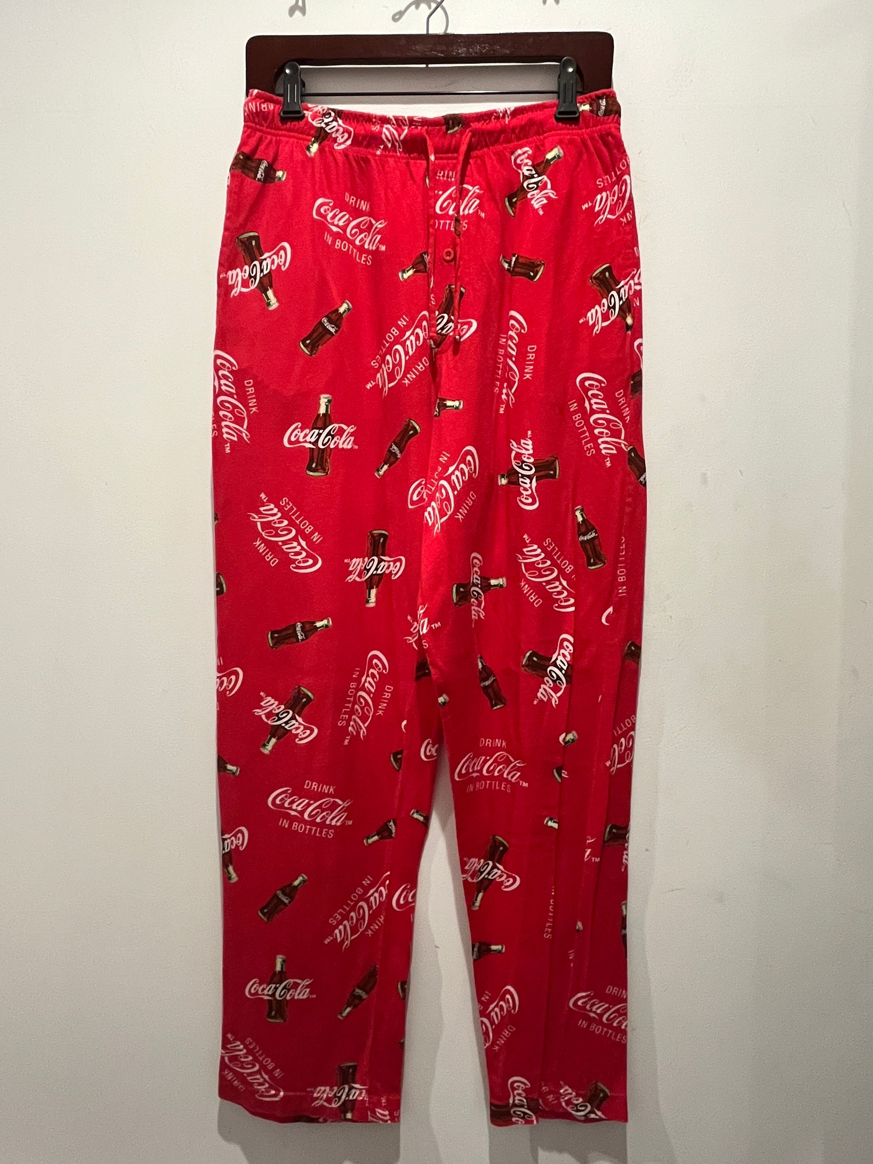 コカコーラのパジャマパンツです。コカコーラらしい赤ボディに瓶コーラとロゴのデザインがとても良い1本です。薄手の生地感でウエストがゴムと紐で調整出来て楽チンに履けるのも魅力的ですね。サイドポケットもありコンディションも良くユニセックスでオススメです。
