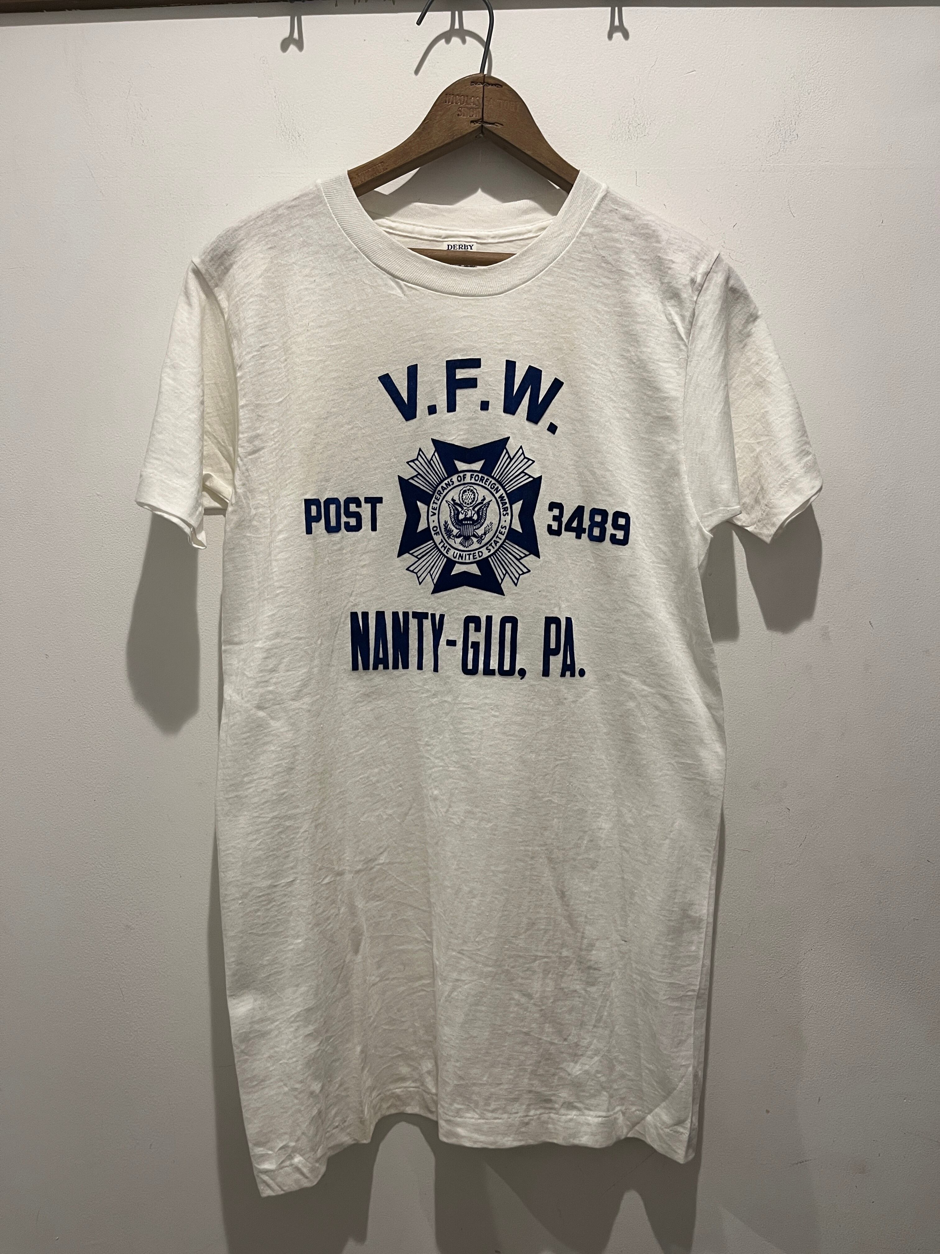 50年代〜60年代アメリカ製ダービーのTシャツです。V.F.W.アメリカ軍の退役軍人組織のアイテムとなるのでミリタリー 関連のTシャツとなります。白ボディにネイビーのフロッキープリントがとても良い1着です。デッドストック特有のまだ着丈が長い状態でフロッキープリントもまだフカフカです。タグもしっかり残っていてビンテージスウェットより出てこないアイテムとして探していた方にはオススメなTシャツです。