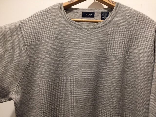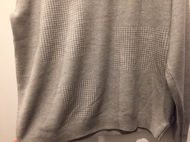 スウェットに近いニットでカラーもライトグレーと万能なカラーリングです。千鳥格子がパネル上に様々な大きさでプリントされているオシャレな1着です。袖の縫い方も独特で腕周りが動きやすいように作られていて着用しやすいのもポイントです。1枚でも着用して良いですしコートのインナーにも最高です。