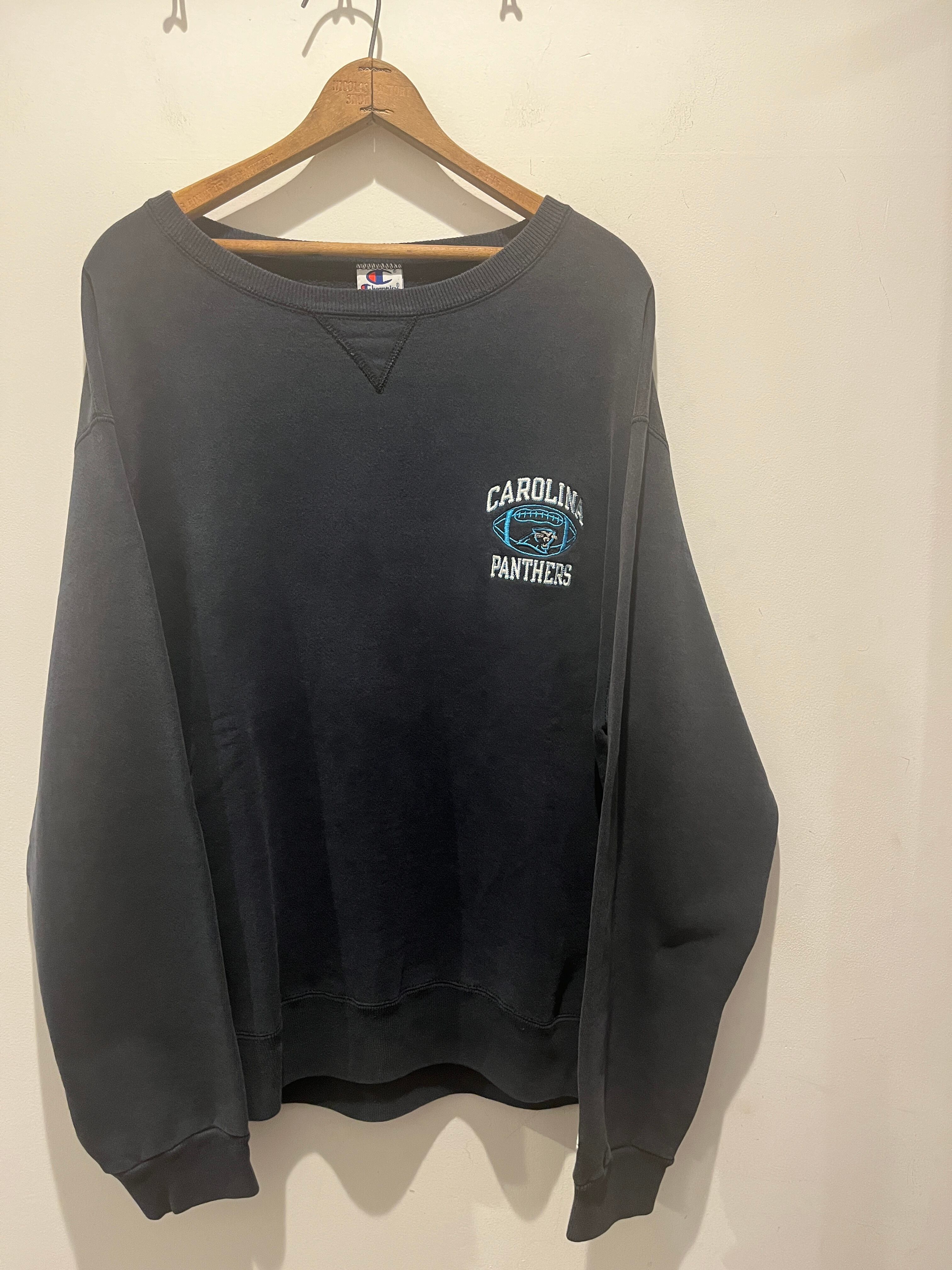 90年代アメリカ製チャンピオンのスウェットです。フェードしたネイビーボディにNFLチームのカロライナ・パンサーズの刺繍が胸に入ります。ラッセルの様な前V仕様で93%コットンと生地感もしっかりしていてユニセックスでオススメなスウェットです。