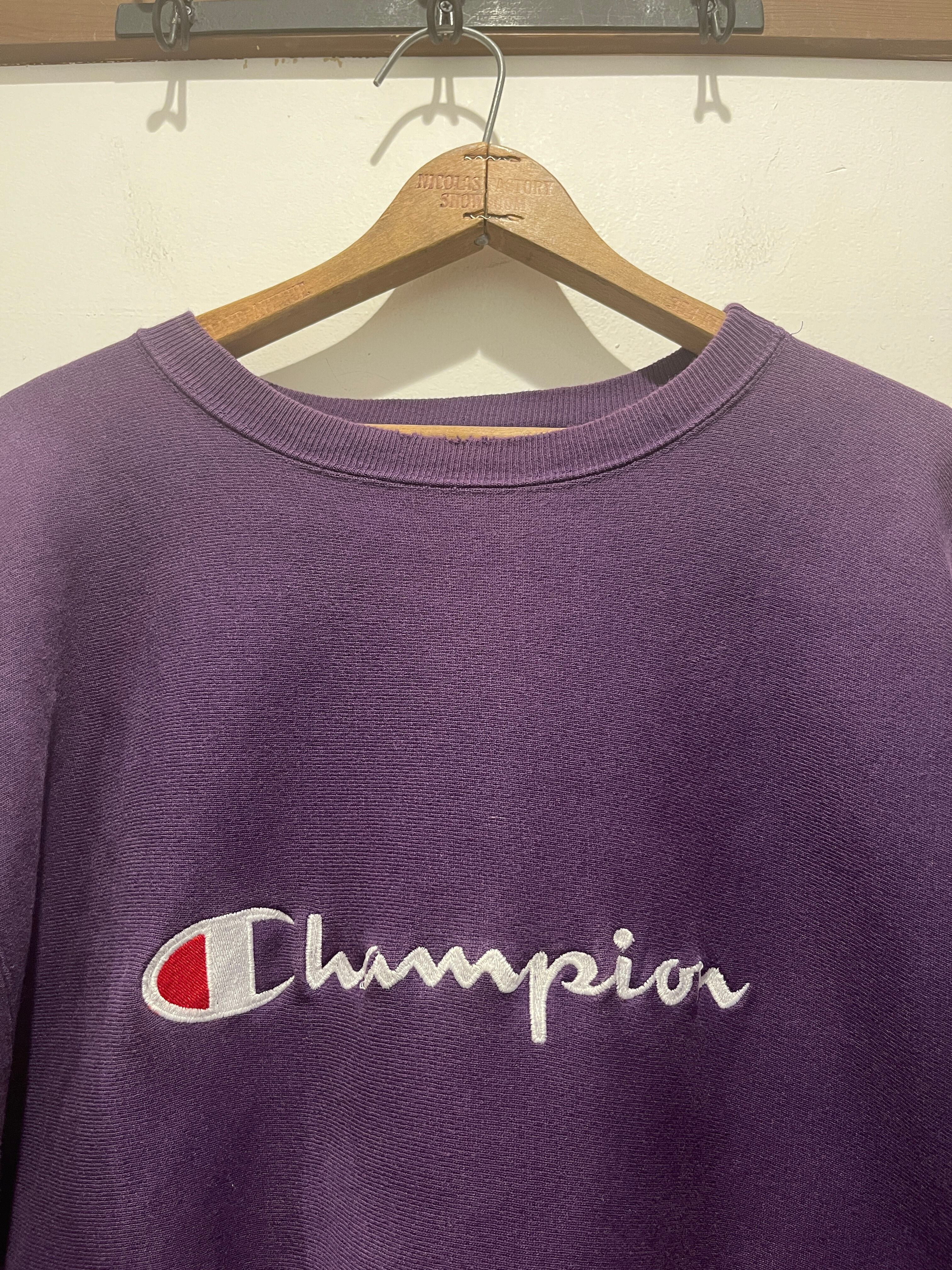 90年代アメリカ製チャンピオンのリバースウィーブです。刺繍タグが付く90年代前半の物でしっかりアメリカ製のリバースとなります。濃いパープルボディに刺繍のスクリプトロゴデザインとなります。生地感もしっかりしていてカラーリングも良くユニセックスでオススメなスウェットです。