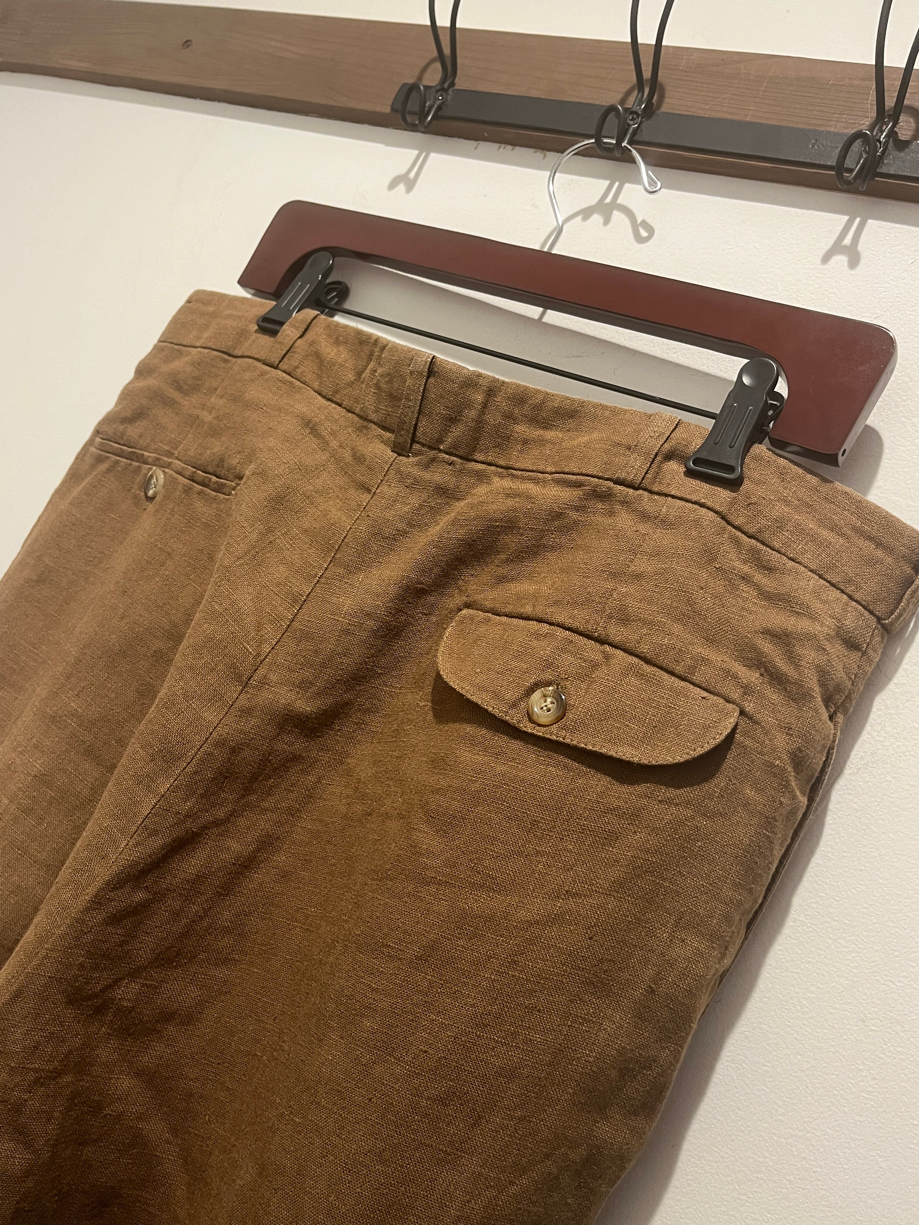 90年代のツータックリネンパンツです。ブラウンカラーでイタリアンリネン100%の上質なパンツです。ツータック仕様やバッグポケットのデザイン、マーブルボタンなど細かいディテールも最高ですね。ドレープ感もありとても良いリネンパンツとオススメです。