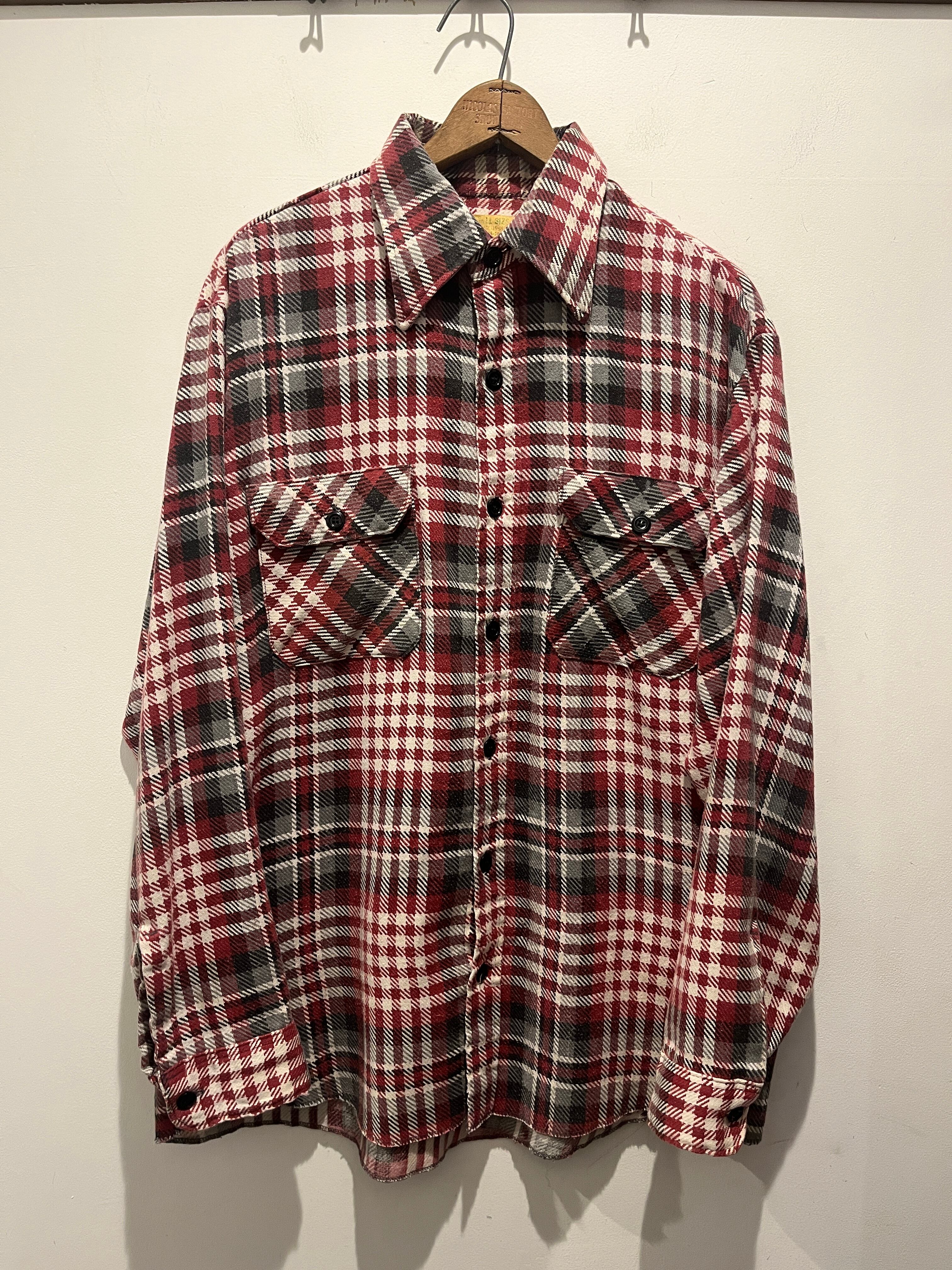 70年代シアーズのプリントネルシャツです。ブラック×ホワイト×グレー×レッドと配色がとても良い1着です。フラップ付きのポケットとボタンがブラックなのも良いですね。プリネルのわりに生地感に厚みがあり、TALL表記ですが着丈もそこまで長すぎずバランスの良い1着とオススメです。