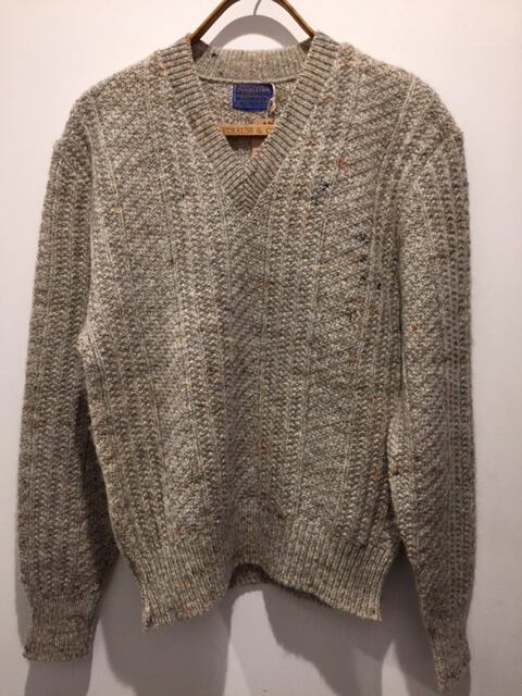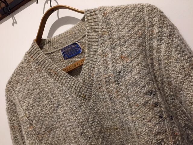 70年代のペンドルトンのニットでウールシャツよりニットの方が玉数が少なく珍しいですね。カラーはベージュベースで所々に色の付いた糸がミックスでさりげなく入ります。当時の定価でもペンドルトンは高くその分しっかりとした作りが魅力的です。VネックなのでインナーにBDシャツを組み合わせてもオシャレですね。