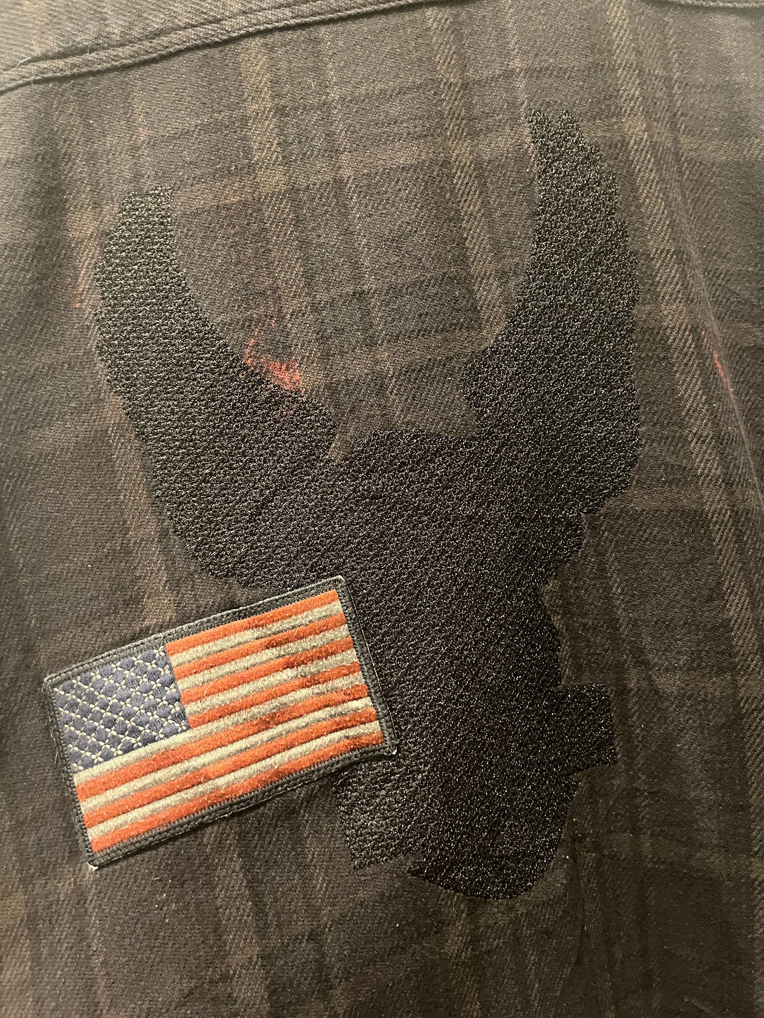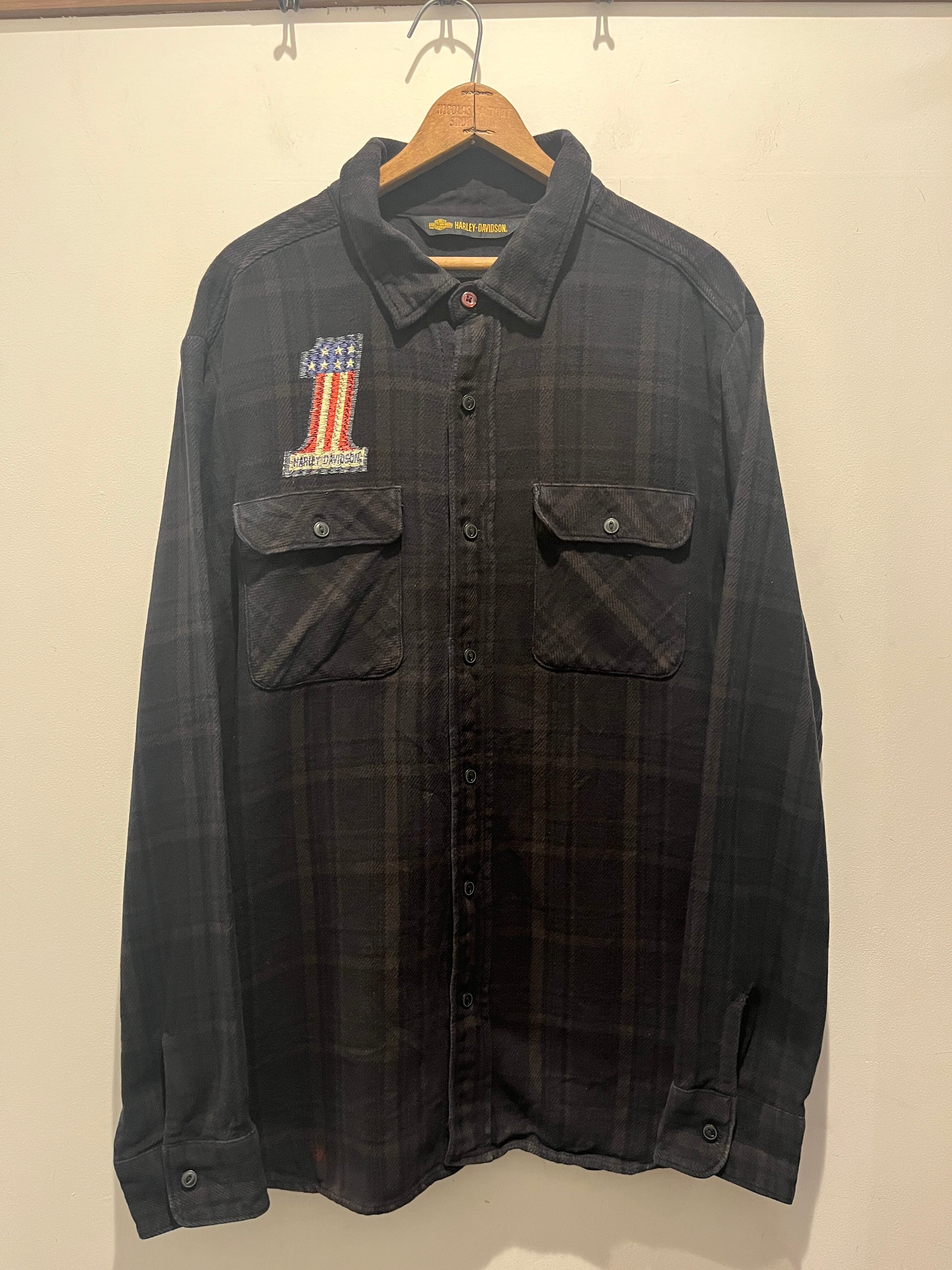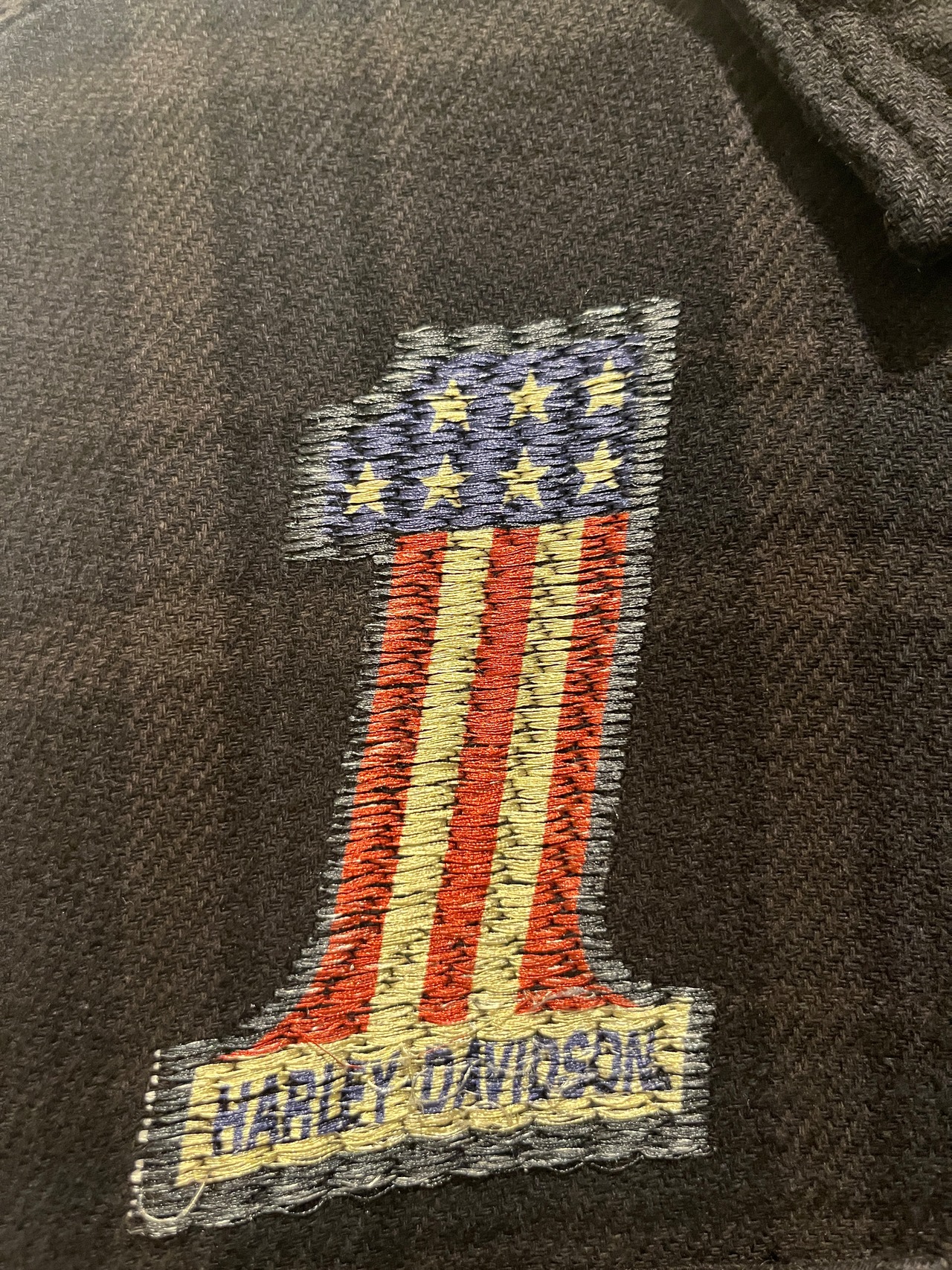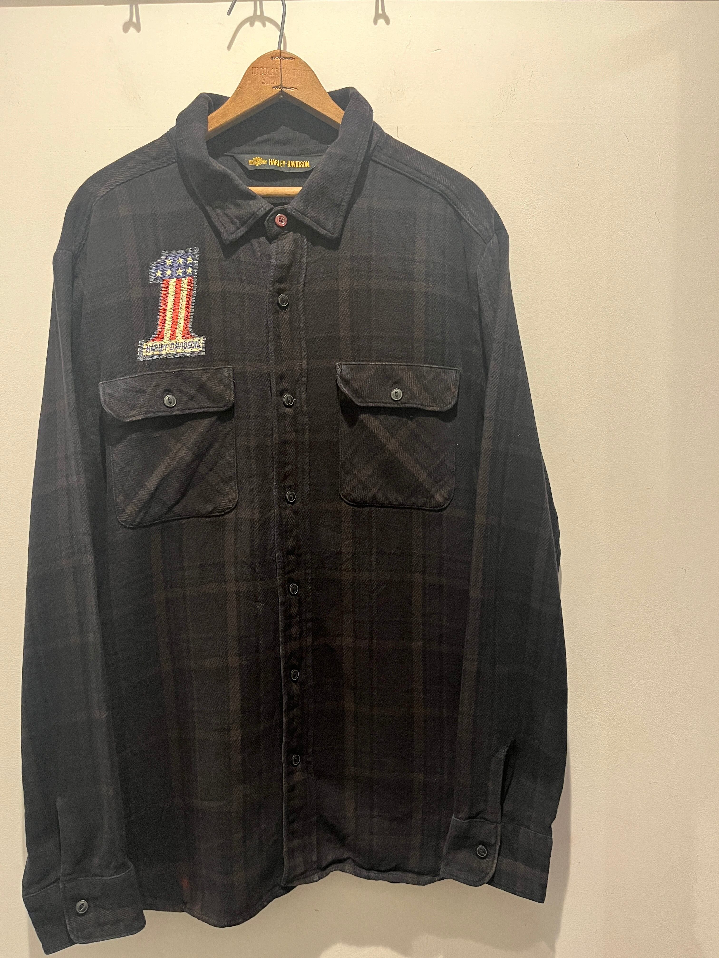 ハーレーダビッドソンのネルシャツシャツです。1903年にアメリカのウィスコンシン州ミルウォーキーで設立されたオートバイメーカー(HARLEY-DAVIDSON)通称ハーレーとしてとても有名ですね。こちらはブラックベースのチェックフロントにはNO1、バッグにはイーグルの刺繍が入りとてもカッコイイ1着です。フラップ付きのポケットに恐らくバイク乗った時に風でバサバサならない様に襟がボタンで留めれたりと細かい所も素晴らしいですね。ペンキなど雰囲気も良くオススメなシャツです。