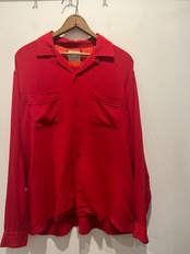 50年代ヴィンテージのレーヨンオープンカラーシャツです。深みのある赤でボタンも赤で統一されてるのがとても良いですね。開襟のレーヨンシャツで身幅も60cm以上の縮みも無く大きめなサイズ感がとても魅力的です。ウール混なのでシワになりにくく、ギャバの様な感じも最高ですね。ボタン欠けも無く全て当時のオリジナルでサイズ感も良くオススメな1着です。