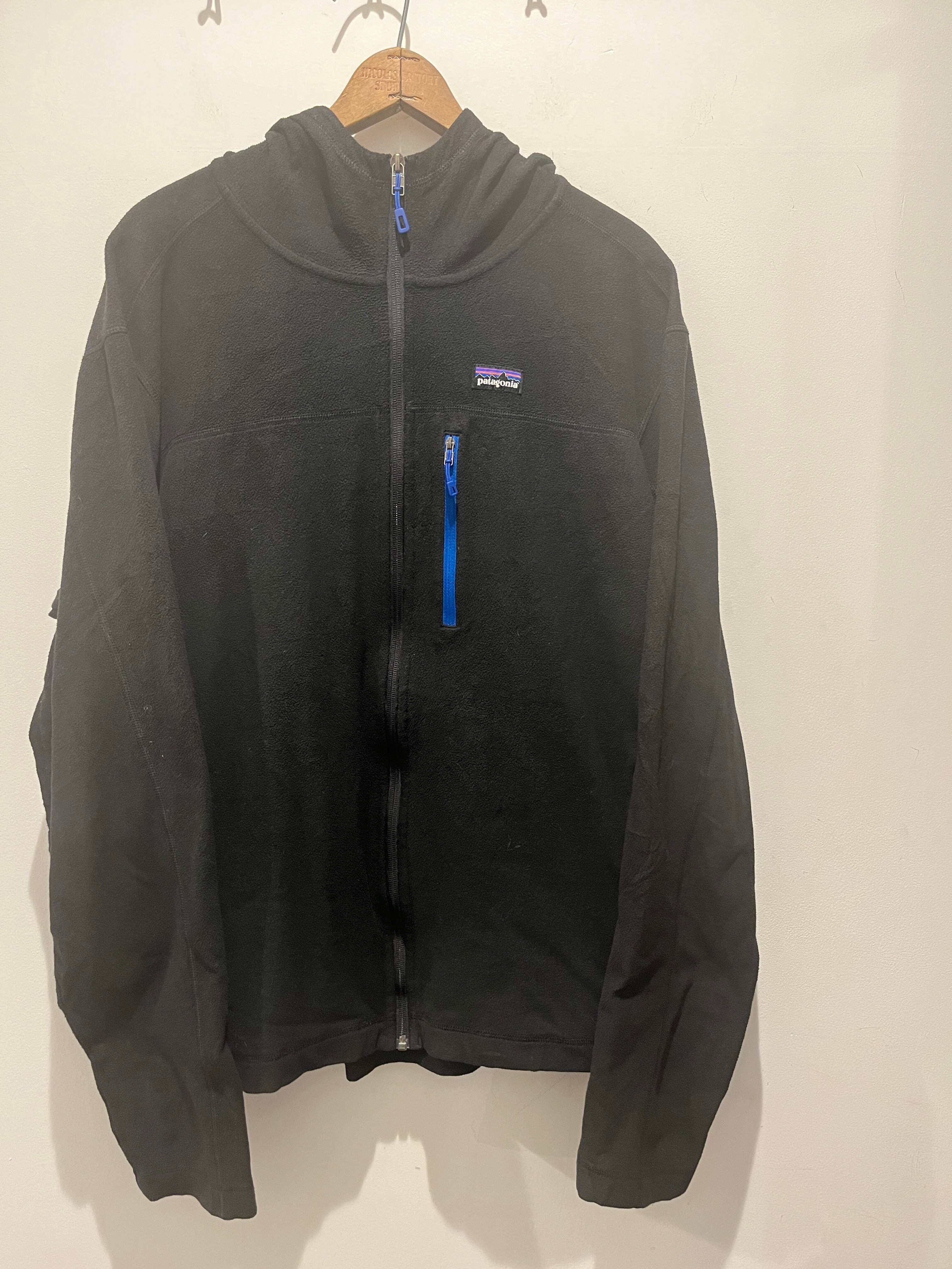 パタゴニアのフルジップフリースパーカーです。2014年のモデルでブラックカラーのフリースでフルジップタイプがとても良い1着です。ブルーのジップポケットもアクセントになっていますね。身幅も広くボックスなシルエットも良くオススメなフリースです。