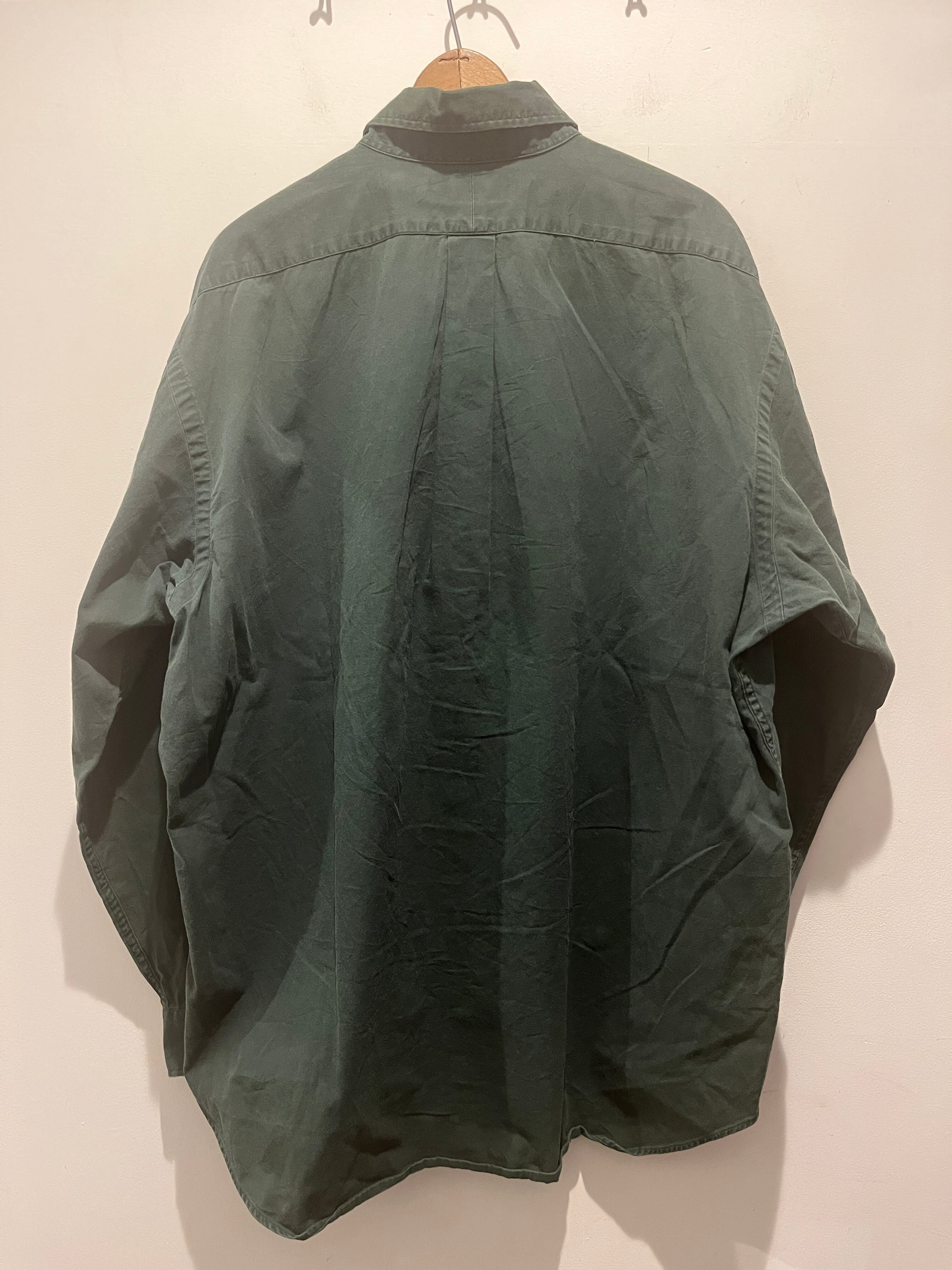 90年代アメリカ製ラルフローレンのシャツです。ダークグリーンカラーで赤ポニーのワンポイントとなります。程良くフェードしたグリーンの色味も最高ですね。身幅もたっぷりあるBLAKEでアメリカ製ラルフとオススメな1着です。