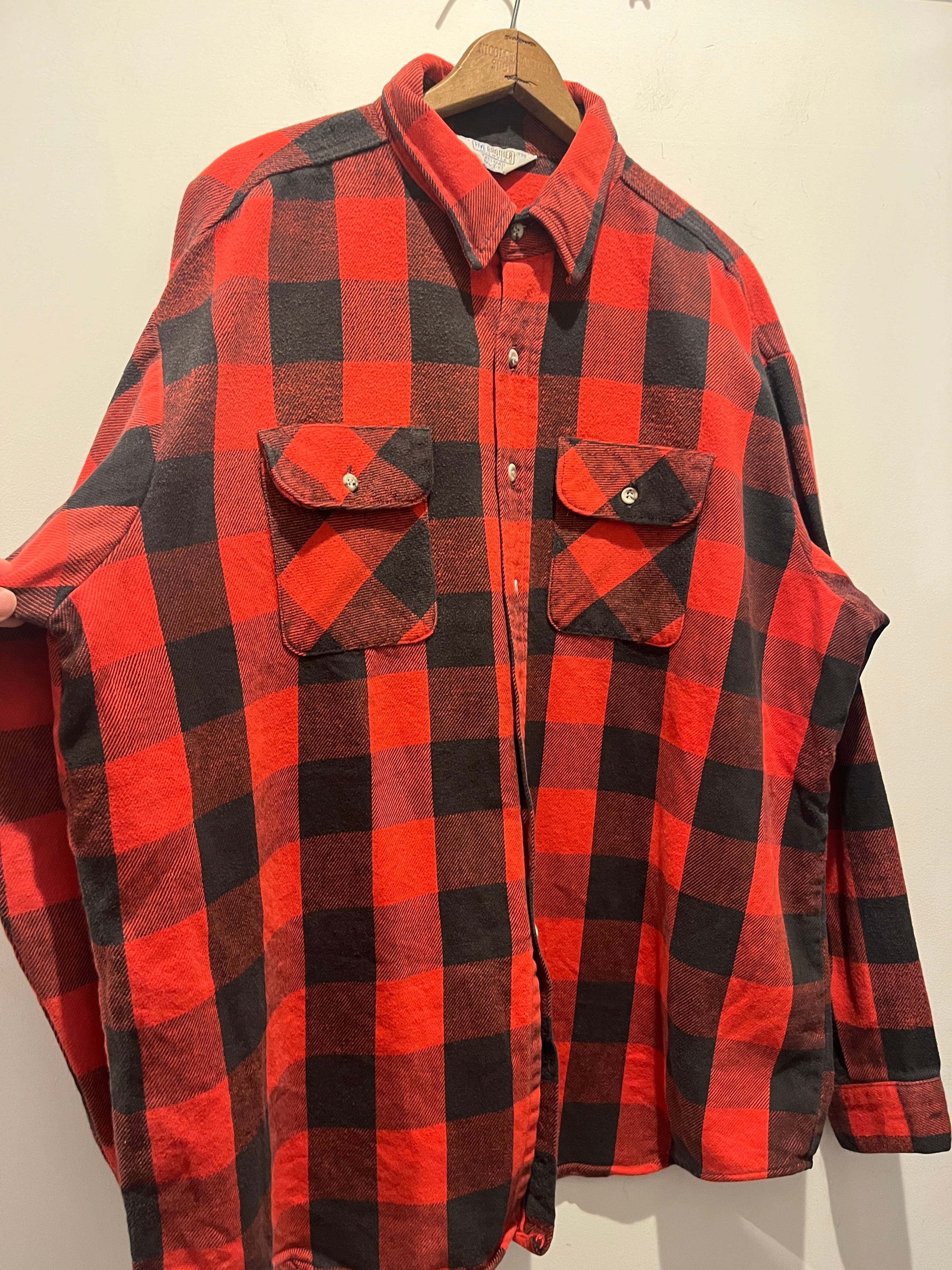 70年代〜80年代アメリカ製ファイブブラザーのネルシャツです。定番の赤×黒のブロックチェックです。そして2XLの大きめなサイズ感で身幅が72cmの広いのがとても良いですね。少しフェードして柔らかくなった生地感が着用しやすく大きめのネルシャツを探していた方にはオススメな1着です。