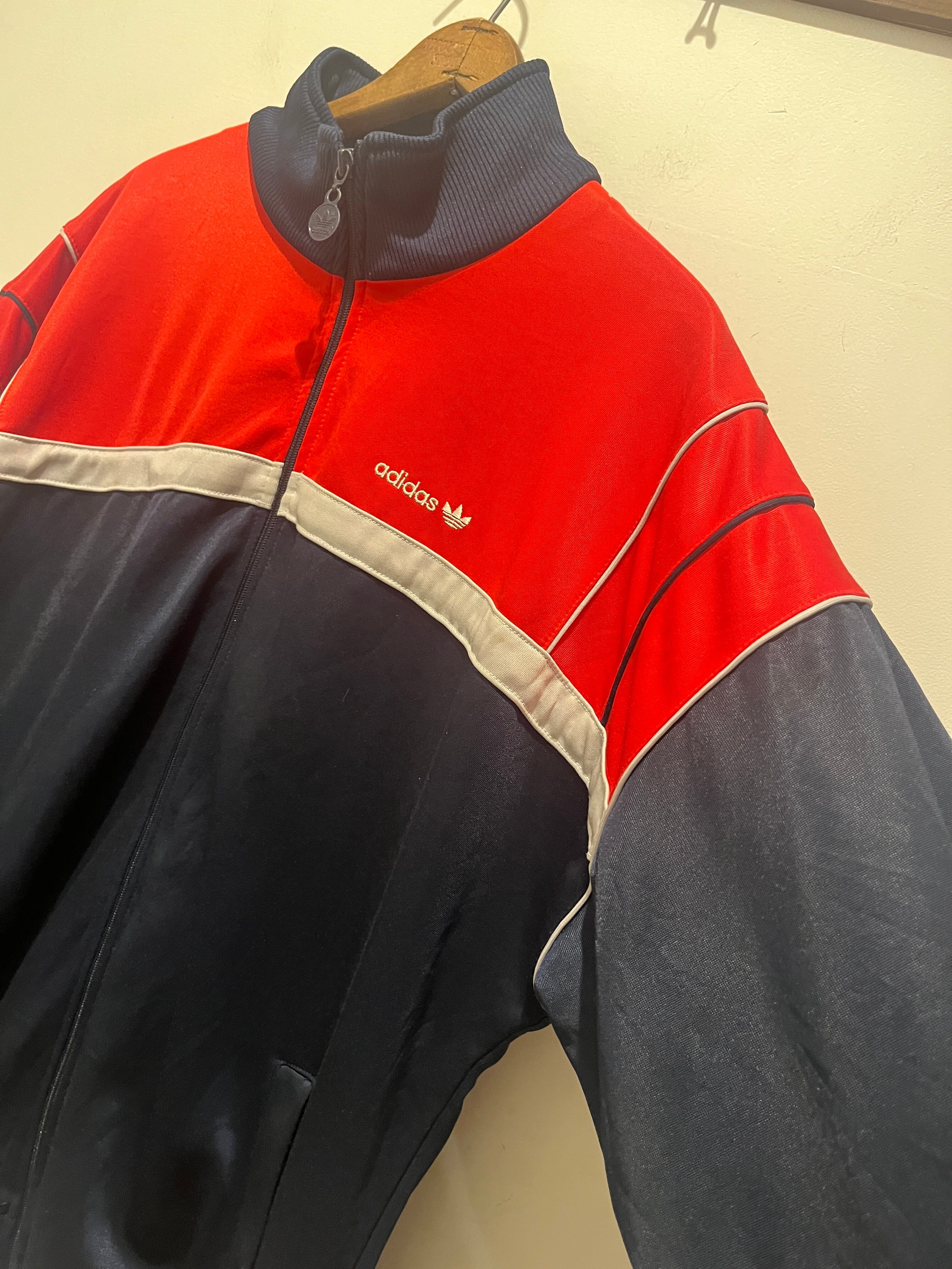 80年代アディダスのトラックジャケットです。80年代前半のアディダスでネイビー×レッド×グレーの良い配色な1着です。80'sは小さいサイズ感が多い中、こちらはXL位の大きめなサイズ感が最高ですね。コンディションも良くユニセックスでオススメです。