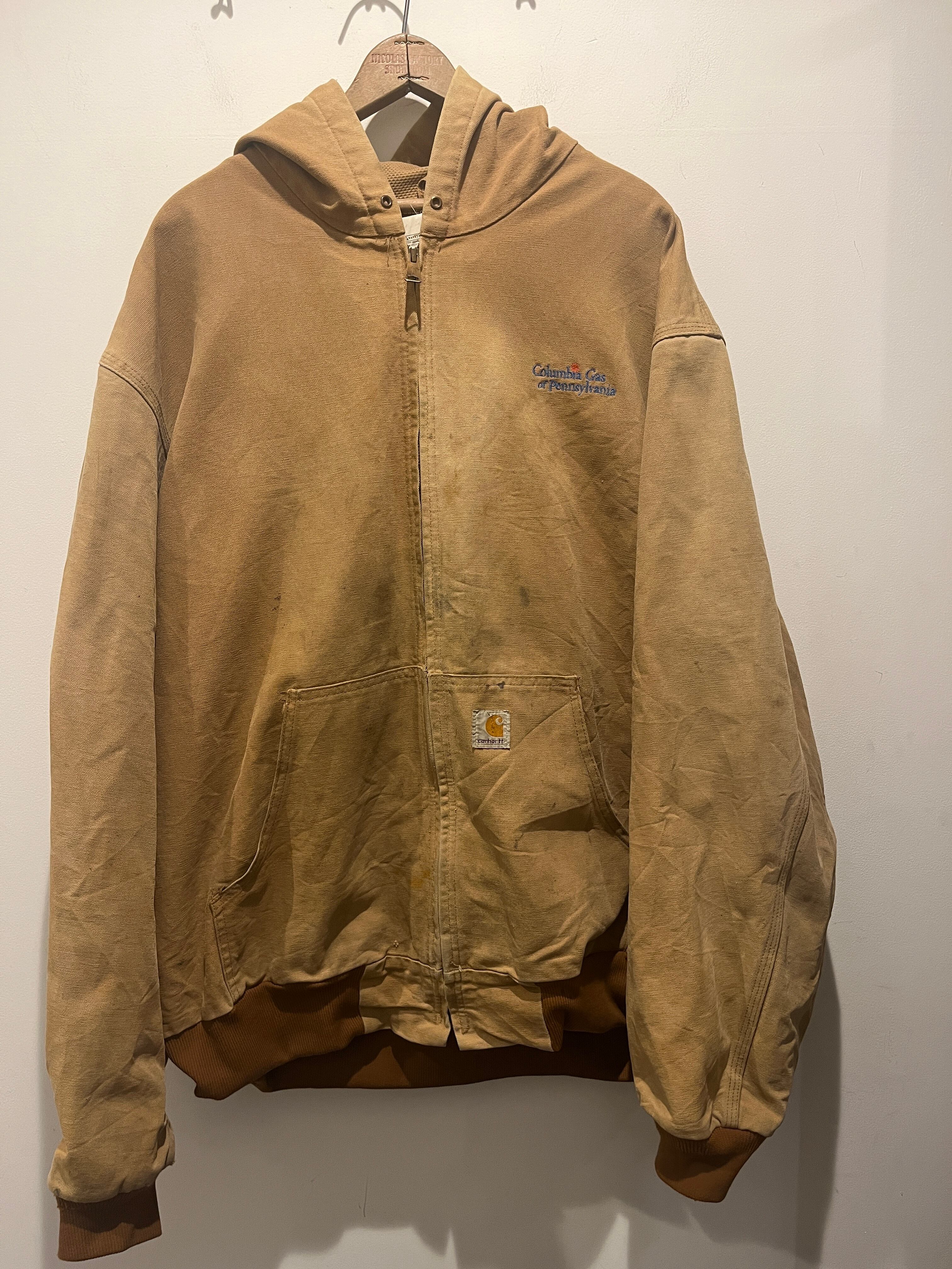 アメリカ製カーハートのアクティブジャケットです。カーハートの名作アクティブジャケット。こちらはアメリカ企業の刺繍が胸に入ります。裏地が中綿無しのサーマルタイプなのも着やすくてポイントですね。アメリカ企業のリアルワーク感と全体的なフェードなど雰囲気が最高な個体となっています。アメリカ製で大きめサイズも良く探していた方には特にオススメです。
