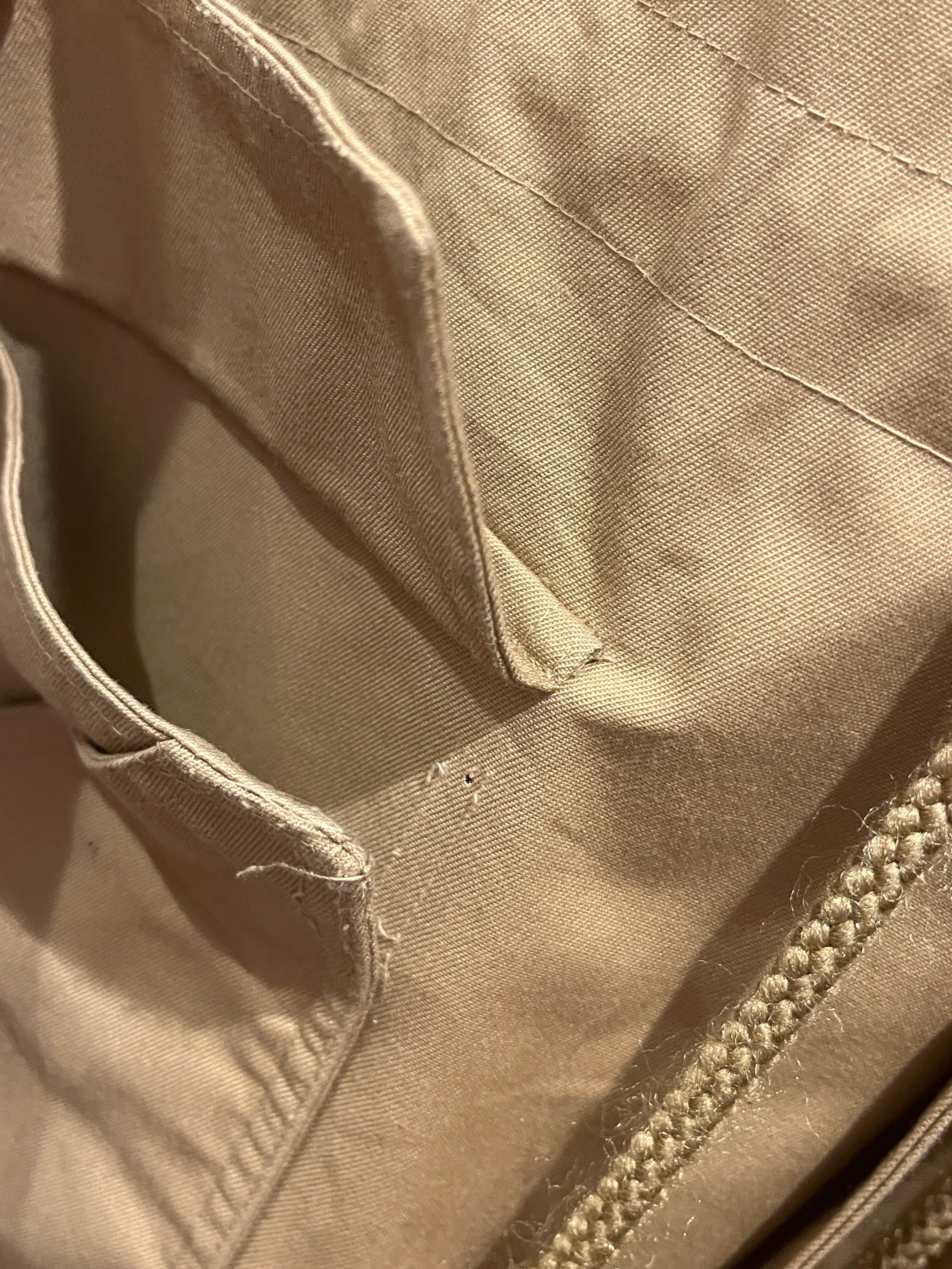 画像の通り右ポケットのステッチ解れとタグ上の紐が片方ステッチ解れがございます。ダメージなどは無く綺麗なコンディションです。