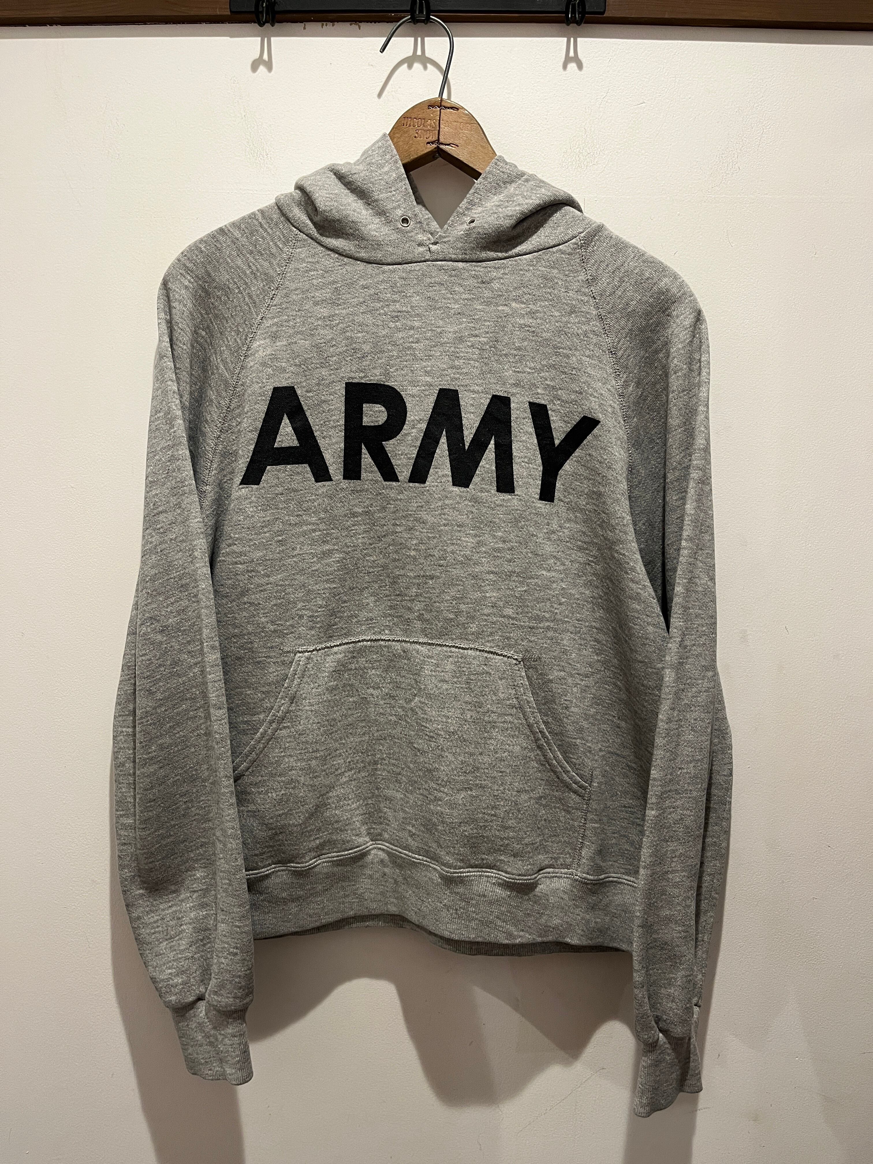90年代アメリカ製アーミープリントのパーカーです。霜降りのグレーボディにブラックでARMYのラバープリントがシンプルですがとても良い1着です。ラグランスリーブで着用しやすく着丈短めの身幅広めシルエットとユニセックスでオススメです。
