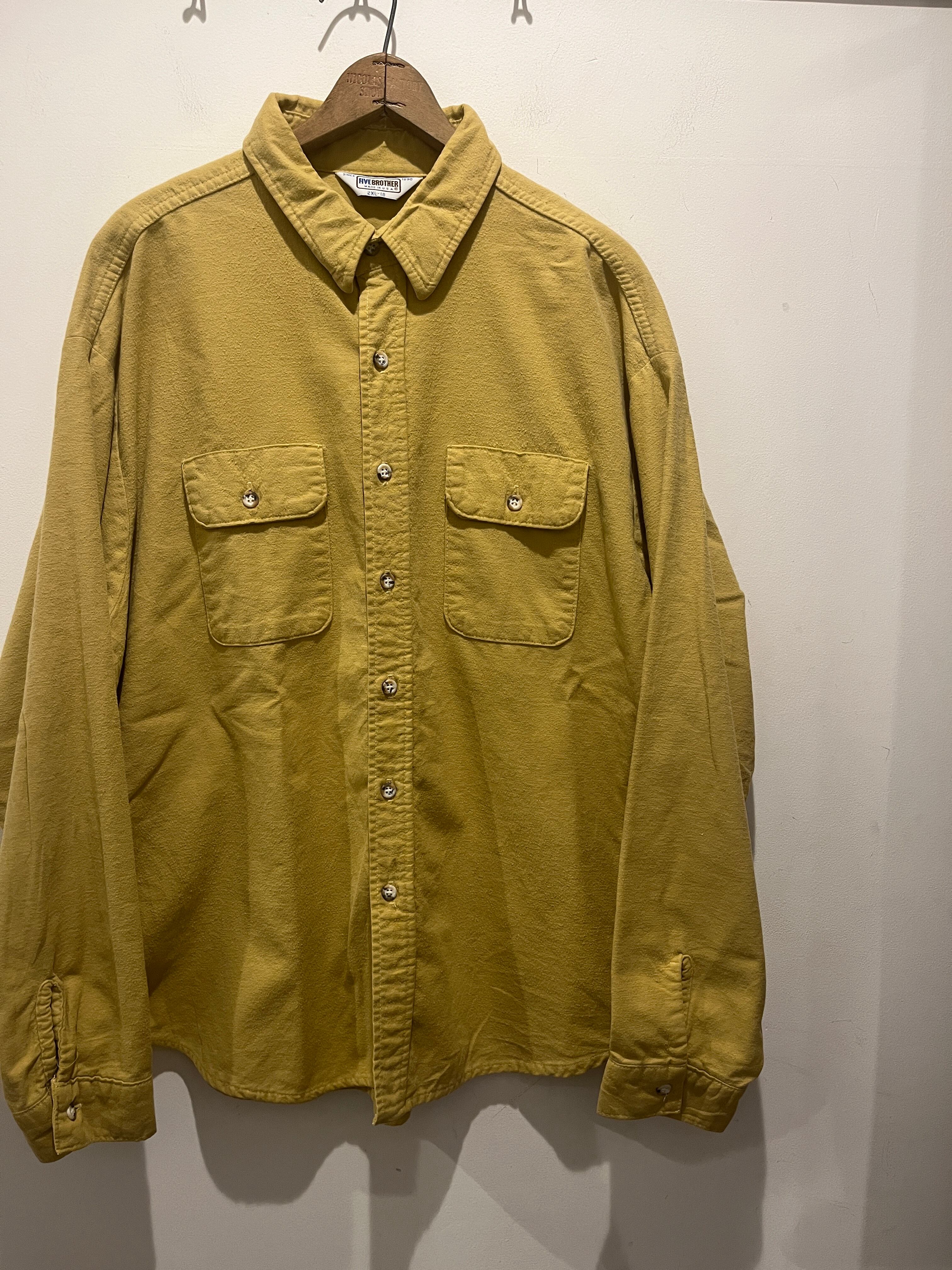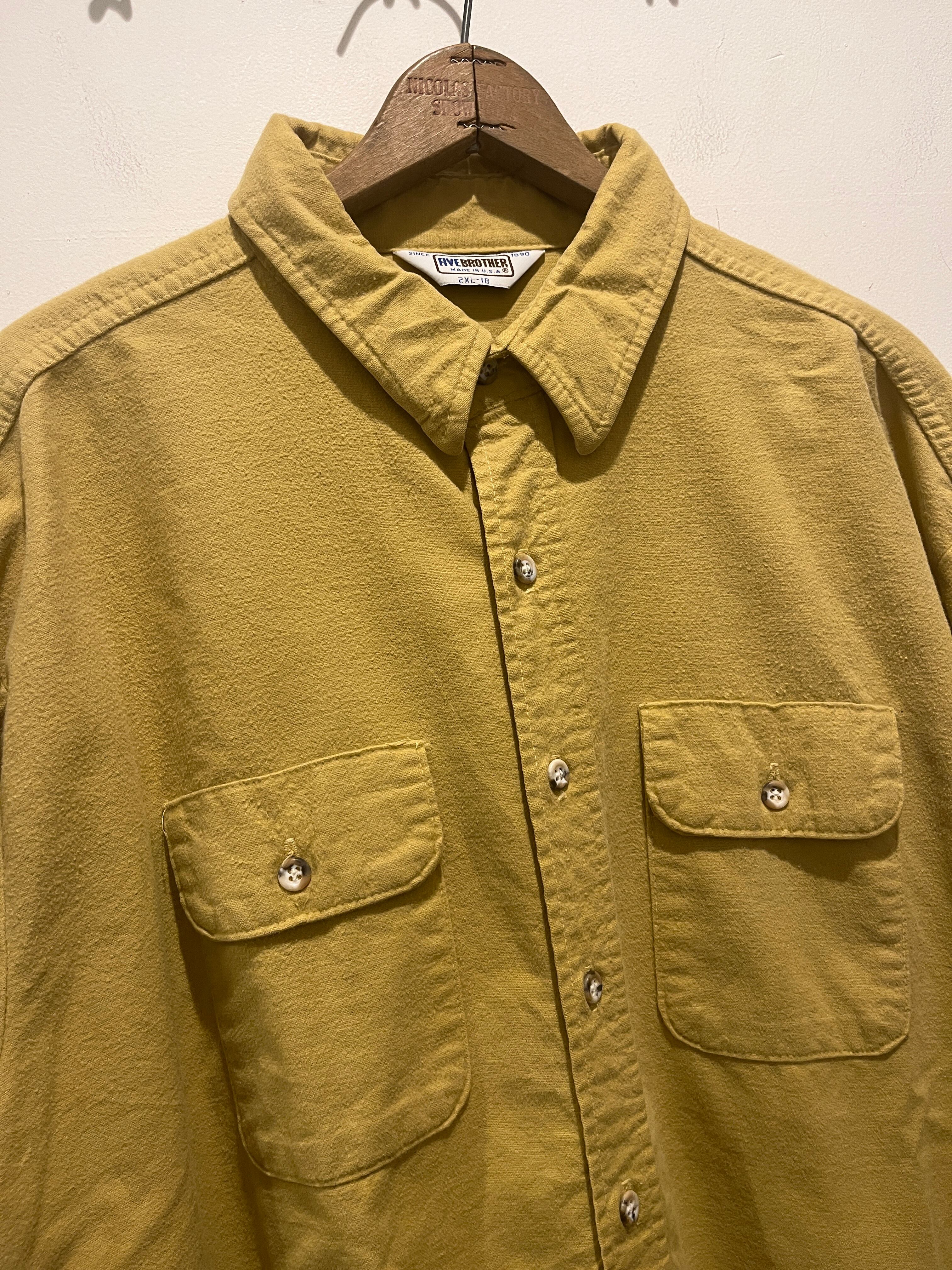 70年代〜80年代アメリカ製ファイブブラザーのネルシャツです。ファイブブラザーといえばチェックのネルシャツが定番ですが、こちらは玉数少ない無地のネルシャツとなります。また身幅が71cmとボックスシルエットの様にゆったり着れるサイズ感も魅力的な1着です。パーカーなどの上に羽織る事も出来てオススメです。