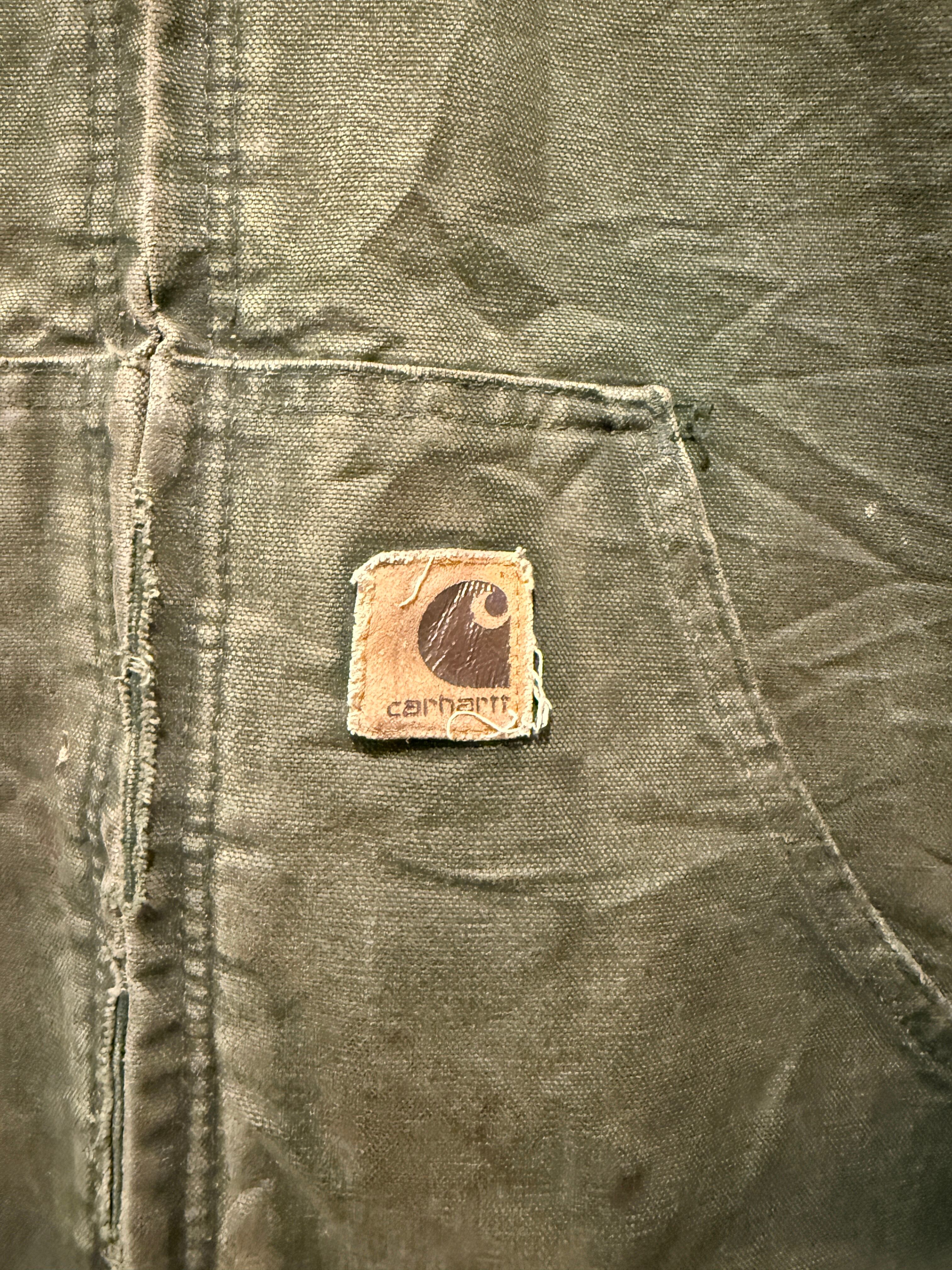2000年代カーハートのアクティブジャケットです。カーハートの名作アクティブジャケット。こちらはグリーンカラーでフェード感が凄い1着となります。裏地が中綿無しのメッシュタイプなのも着やすくて良いですね。アメリカの作業で実際着ていたと思われるリアルワーク感と全体的なフェードなど雰囲気が最高な個体となっていてオススメです。