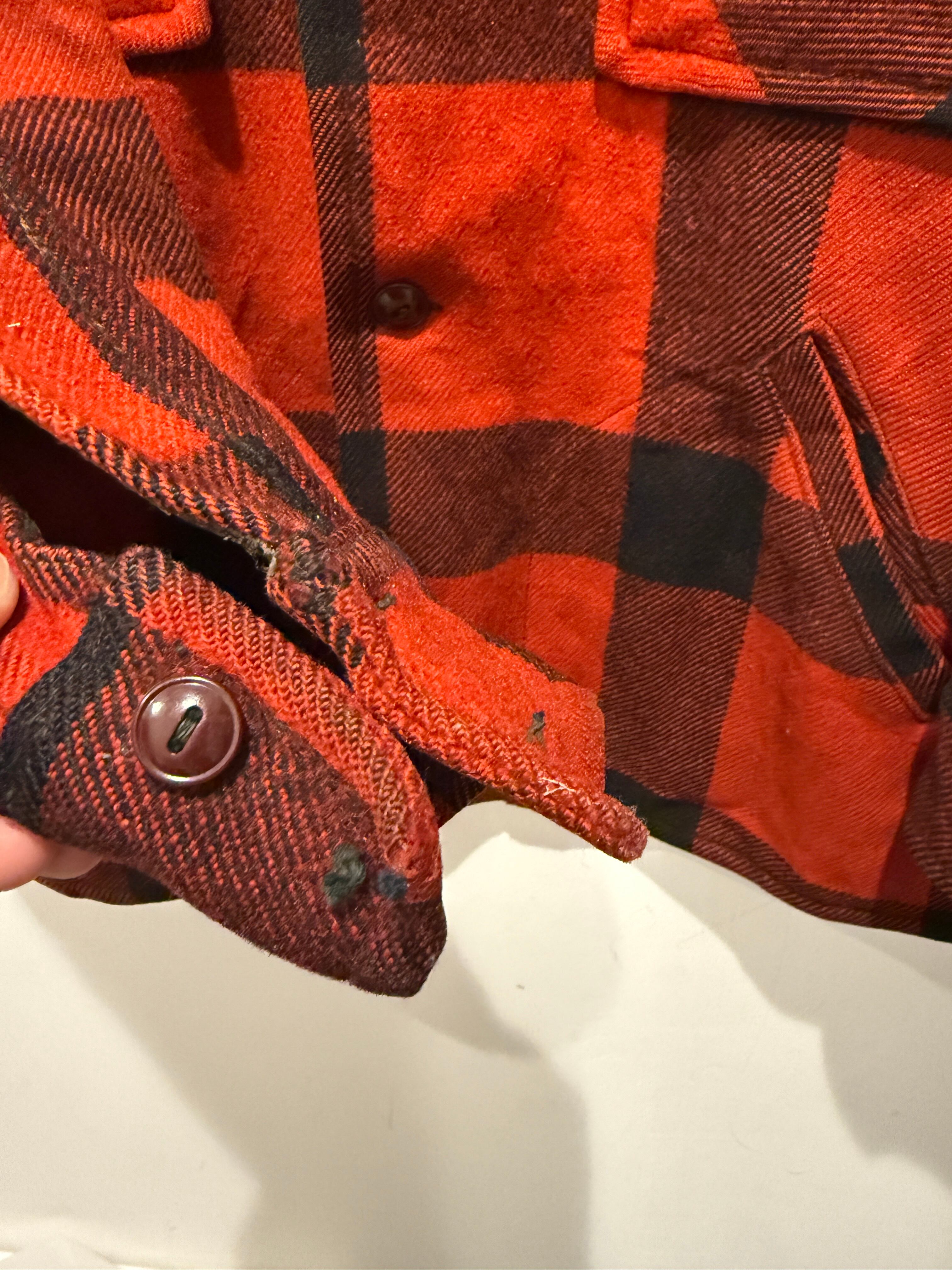 50年代ヴィンテージウールリッチのウールジャケットです。ブラック×レッドのバッファローチェックで古い黒タグのウールリッチです。ボタンも2つ穴の古いタイプがとても良いですね。着丈も長すぎづバランス良くとオススメな1着です。