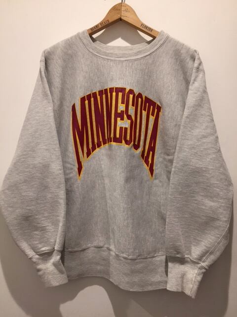 カラーはグレーです。刺繍タグが付く90年代前半のアメリカ製チャンピオンです。ミネソタのロゴがアーチ状にデザインされプリントもエンジ×イエローが良い感じです。リバースのグレーでシミやスレが無くコンディションの良い物も減って来ているので気になる方は今のうちがオススメです。