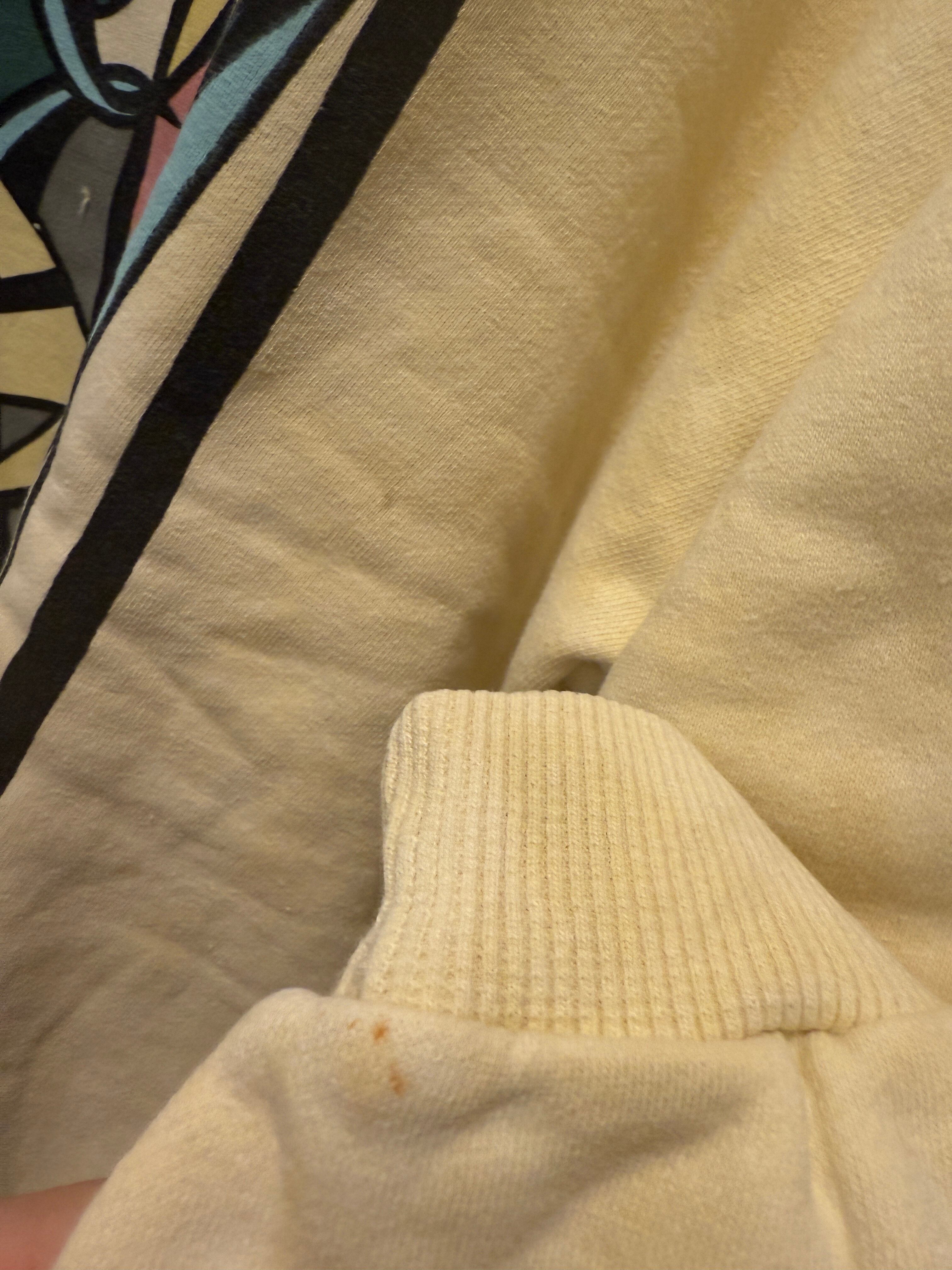 画像の通りプリント部分に擦れ、袖にシミ、全体的にブリーチがかった感じがあります。大きなダメージなどは無く着用には問題ある無いコンディションです。