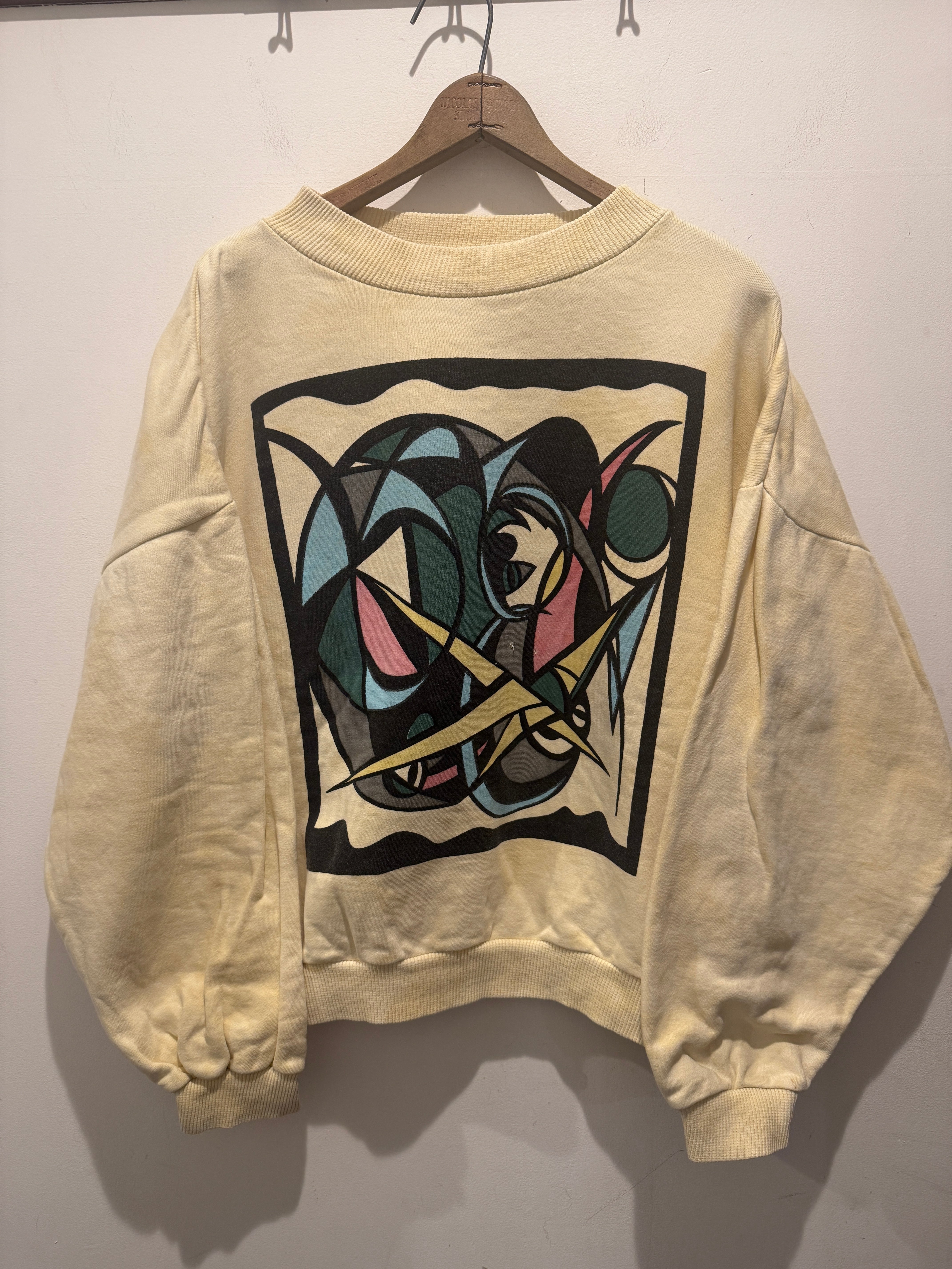 90年代STUDIO UMENのデザインスウェットです。デザイン古着の名ブランドUMEN。こちらはブリーチがかったイエローボディにアートプリントがとてもお洒落な1着です。また着丈が短くて身幅の広いシルエットも変わっていて、デザインと合わせても珍しい変わり種なスウェットとなります。