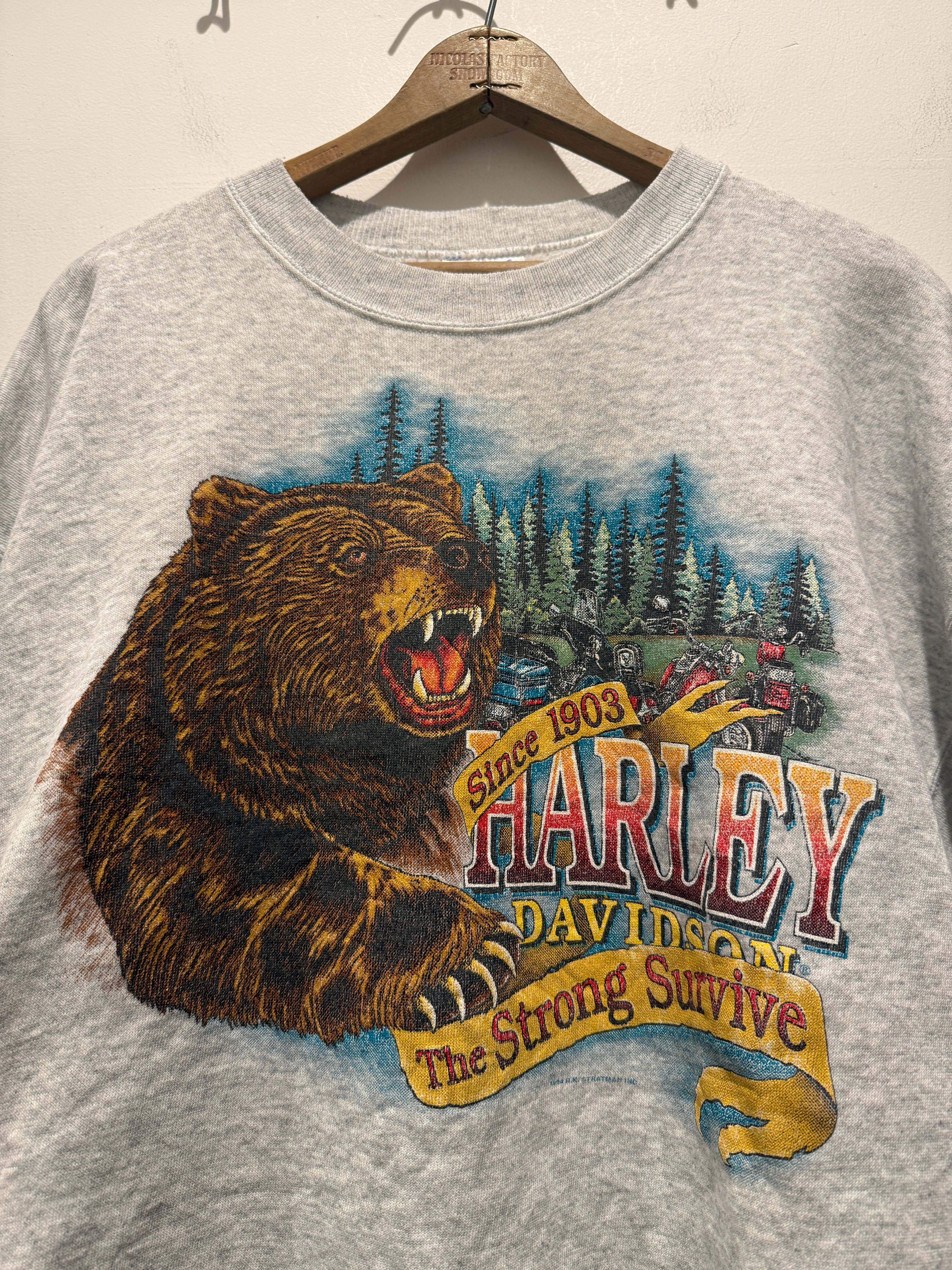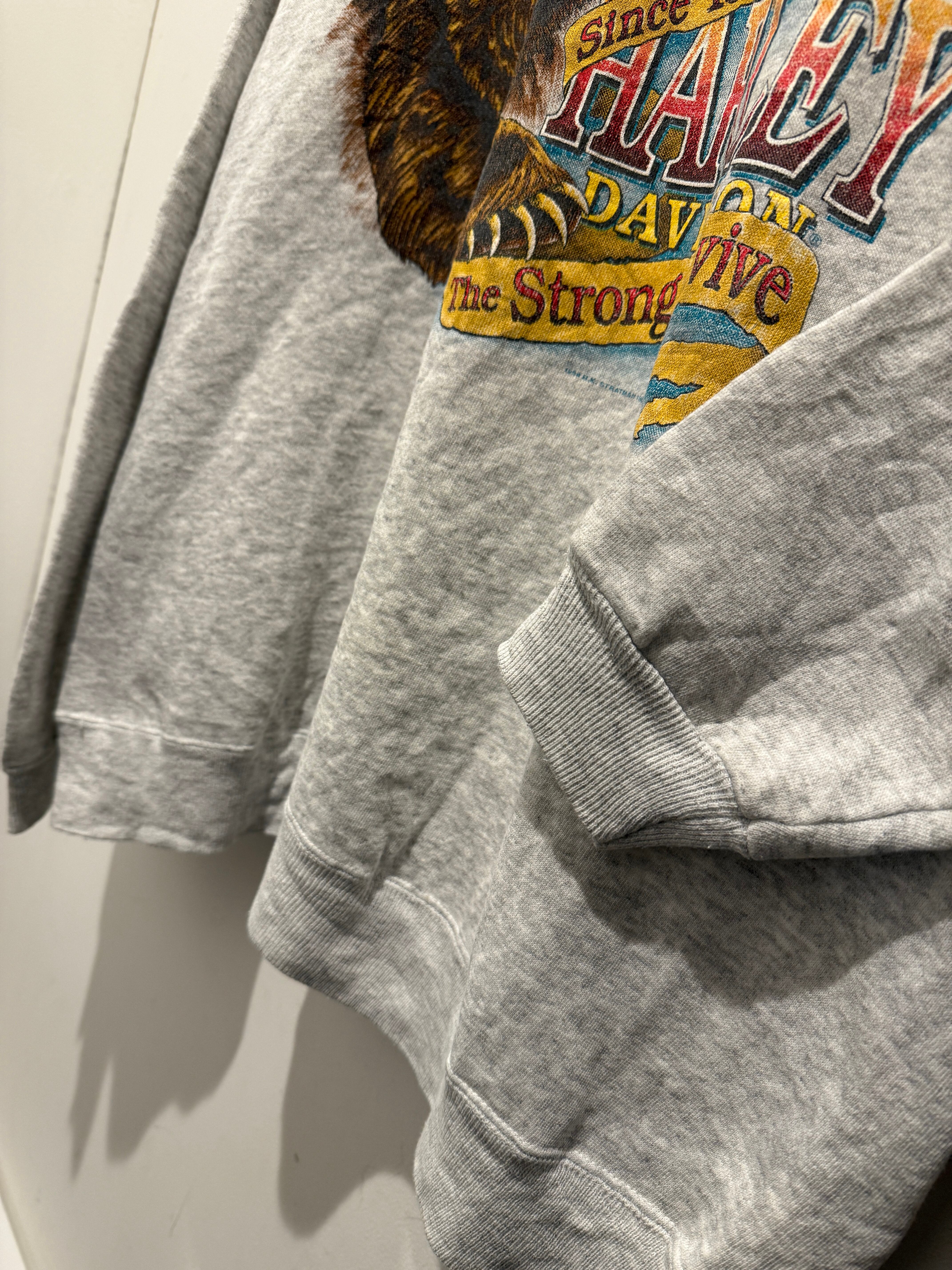 90年代のアメリカ製ハーレースウェットです。TシャツやロンTよりも見かける事の少ないハーレーのスウェットとなります。グレーボディにフロントとバッグにプリントがしっかりデザインされてるのがとても良いですね。着丈が長すぎないボックスシルエットと形も良くXLサイズとオススメな1着です。