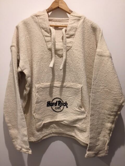 カラーはオフホワイトです。柄物のメキシカンパーカーが多い中、こちらは無地タイプとなります。無地にハードロックカフェのデザインがオシャレな1着です。古着でもハードロックカフェ物を集めている方も多く人気が高いアイテムですね。